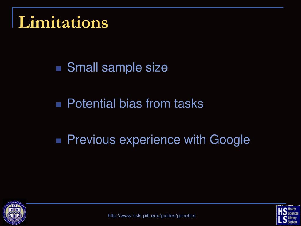Limitations • Small sample size • Potentialbiasfromtasks • Previousexperiencewith Google http://www.hsls.pitt.edu/guides/genetics