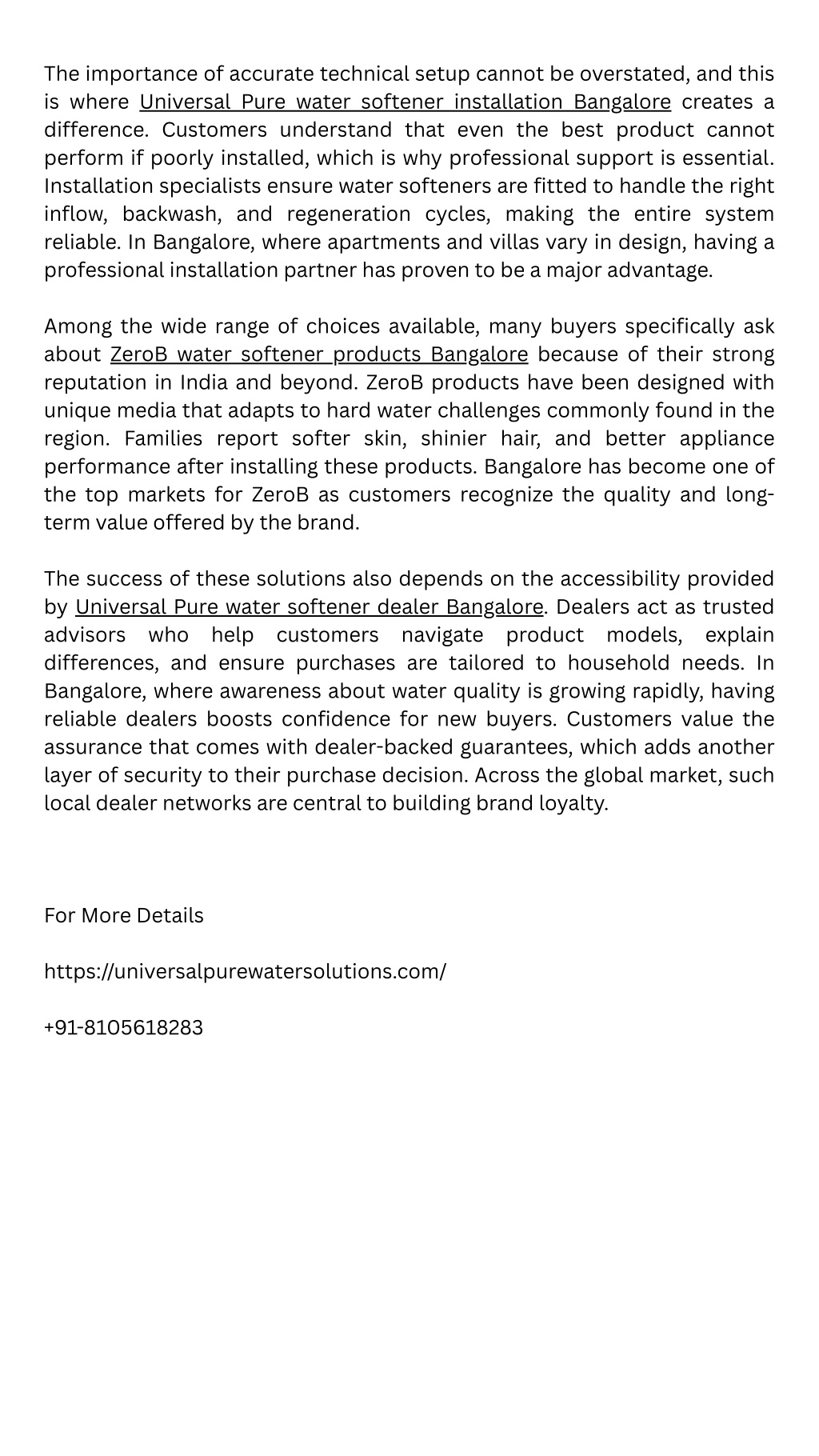 The importance of accurate technical setup cannot be overstated, and this is where Universal Pure water softener installation Bangalore creates a difference. Customers understand that even the best product cannot perform if poorly installed, which is why professional support is essential. Installation specialists ensure water softeners are fitted to handle the right inflow, backwash, and regeneration cycles, making the entire system reliable. In Bangalore, where apartments and villas vary in design, having a professional installation partner has proven to be a major advantage. Among the wide range of choices available, many buyers specifically ask about ZeroB water softener products Bangalore because of their strong reputation in India and beyond. ZeroB products have been designed with unique media that adapts to hard water challenges commonly found in the region. Families report softer skin, shinier hair, and better appliance performance after installing these products. Bangalore has become one of the top markets for ZeroB as customers recognize the quality and long- term value offered by the brand. The success of these solutions also depends on the accessibility provided by Universal Pure water softener dealer Bangalore. Dealers act as trusted advisors who help customers navigate product models, explain differences, and ensure purchases are tailored to household needs. In Bangalore, where awareness about water quality is growing rapidly, having reliable dealers boosts confidence for new buyers. Customers value the assurance that comes with dealer-backed guarantees, which adds another layer of security to their purchase decision. Across the global market, such local dealer networks are central to building brand loyalty. For More Details https://universalpurewatersolutions.com/ +91-8105618283