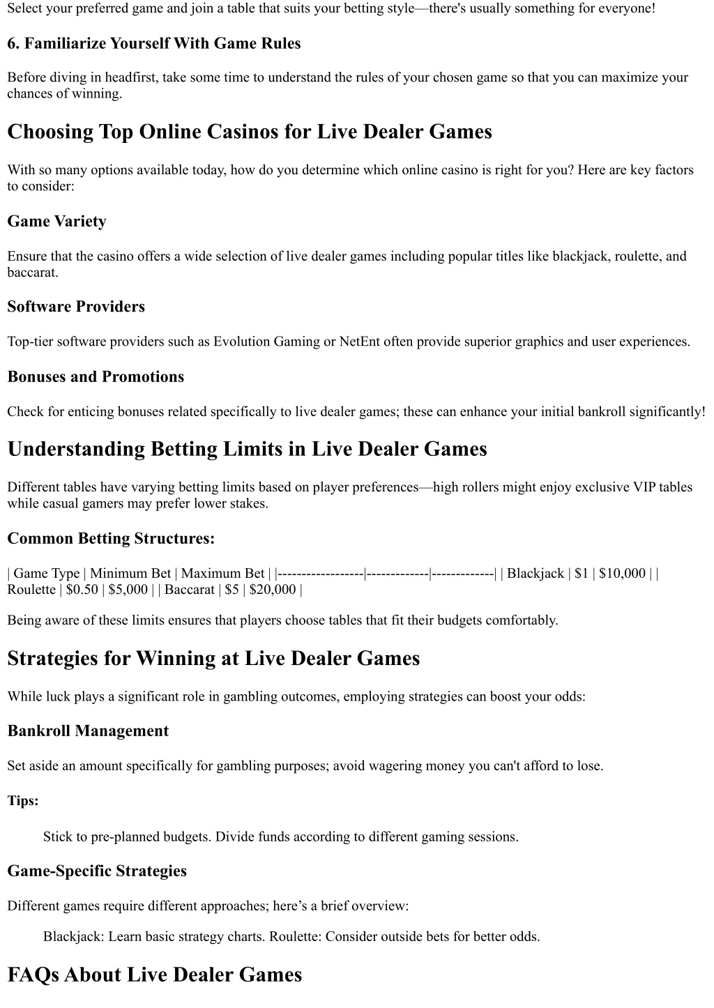 Select your preferred game and join a table that suits your betting style—there's usually something for everyone! 6. Familiarize Yourself With Game Rules Before diving in headfirst, take some time to understand the rules of your chosen game so that you can maximize your chances of winning. Choosing Top Online Casinos for Live Dealer Games With so many options available today, how do you determine which online casino is right for you? Here are key factors to consider: Game Variety Ensure that the casino offers a wide selection of live dealer games including popular titles like blackjack, roulette, and baccarat. Software Providers Top-tier software providers such as Evolution Gaming or NetEnt often provide superior graphics and user experiences. Bonuses and Promotions Check for enticing bonuses related specifically to live dealer games; these can enhance your initial bankroll significantly! Understanding Betting Limits in Live Dealer Games Different tables have varying betting limits based on player preferences—high rollers might enjoy exclusive VIP tables while casual gamers may prefer lower stakes. Common Betting Structures: | Game Type | Minimum Bet | Maximum Bet | |------------------|-------------|-------------| | Blackjack | $1 | $10,000 | | Roulette | $0.50 | $5,000 | | Baccarat | $5 | $20,000 | Being aware of these limits ensures that players choose tables that fit their budgets comfortably. Strategies for Winning at Live Dealer Games While luck plays a significant role in gambling outcomes, employing strategies can boost your odds: Bankroll Management Set aside an amount specifically for gambling purposes; avoid wagering money you can't afford to lose. Tips: Stick to pre-planned budgets. Divide funds according to different gaming sessions. Game-Specific Strategies Different games require different approaches; here’s a brief overview: Blackjack: Learn basic strategy charts. Roulette: Consider outside bets for better odds. FAQs About Live Dealer Games