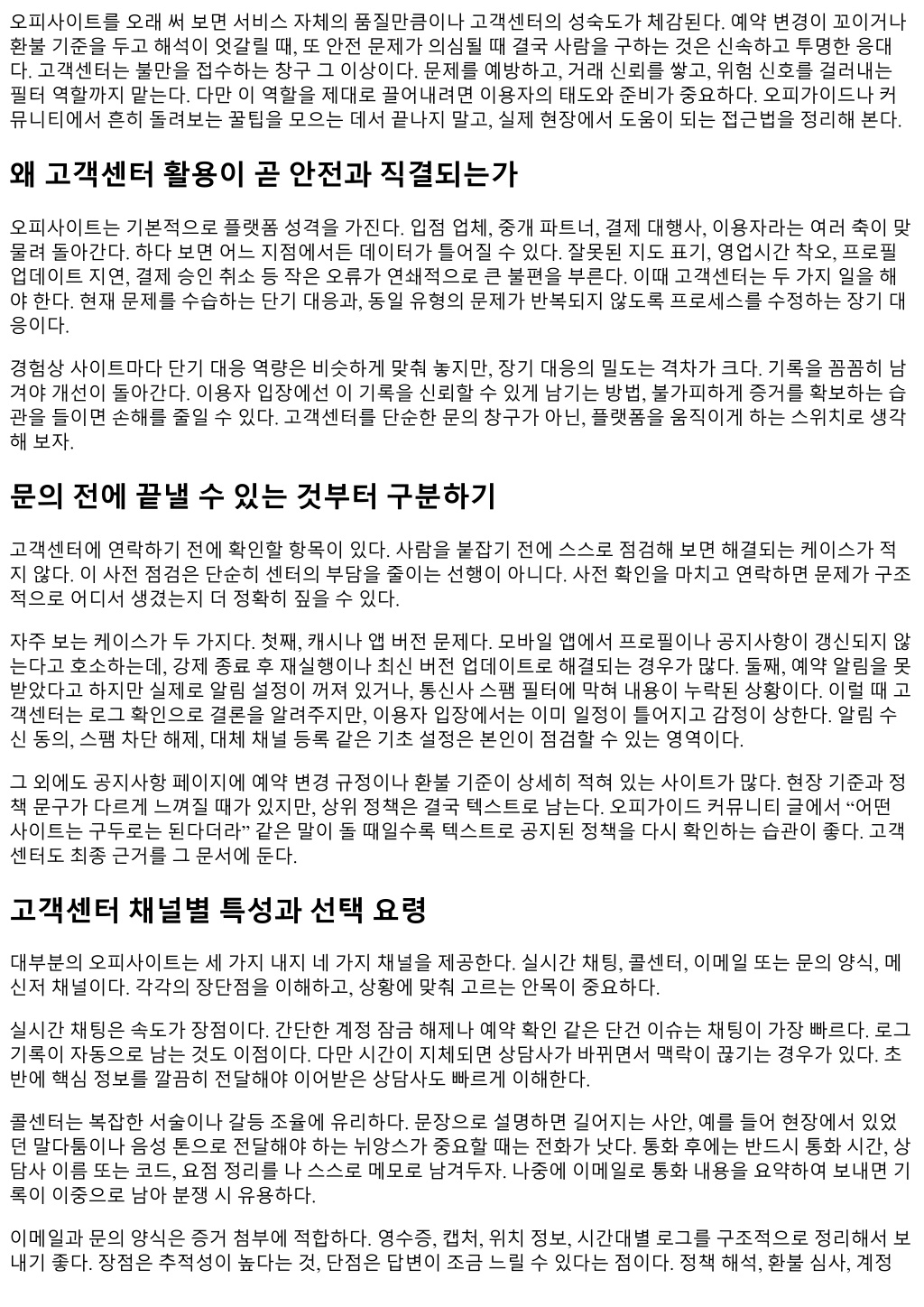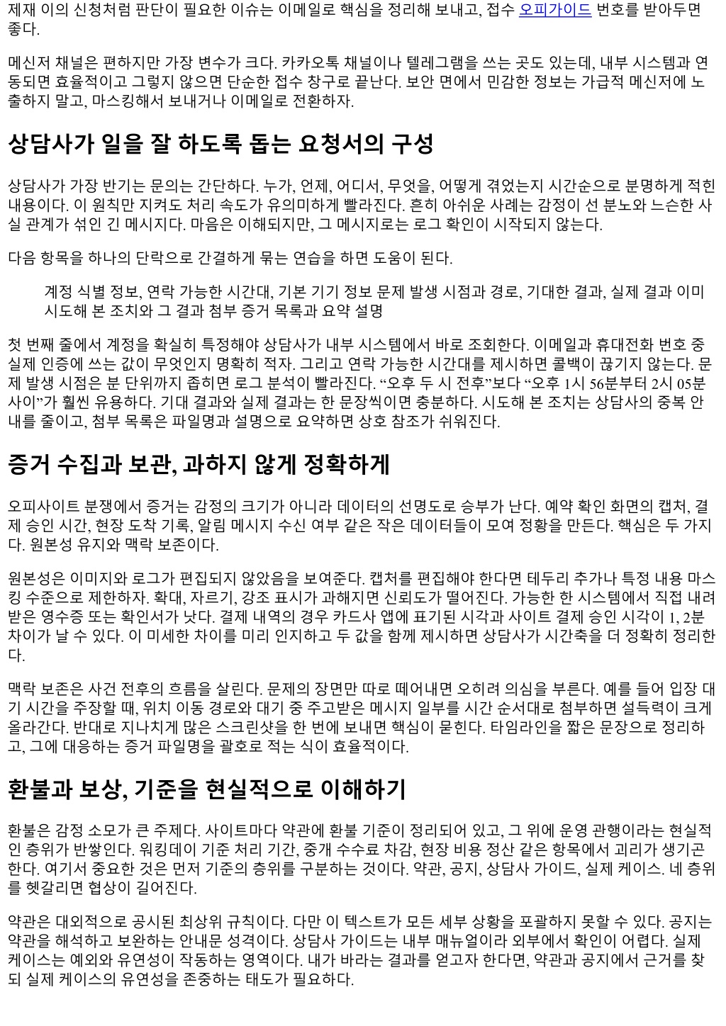 환불요청의설득력은타당한사유와입증자료로결정된다. 단순변심은대부분부분환불또는포인트전환으 로유도된다. 서비스미제공, 중대한정보불일치, 안전문제발생같은경우는전액환불에가까운판단이가능 하다. 변칙적인상황도있다. 예를들어외부변수가개입된예약지연, 갑작스런지역통제, 결제모듈장애등은 이용자와업체모두피해자에가까운사례다. 이런경우에는깔끔한전액환불보다는, 포인트보상과일부환불 의절충안을제시하는게더빨리끝난다. 고객센터도현실을반영한타협안을선호한다. 응대지연과 escalation, 밀고당기는타이밍 상담이길어지면불안이커지고말이거칠어진다. 하지만푸시의타이밍을잘못잡으면오히려지연이더길어 진다. 내부처리의평균시간을파악하는게우선이다. 간단한결제환불은 1, 3영업일내처리되는편이고, 계정 제재이의신청은 5, 7영업일정도를잡는경우가많다. 이범위를넘어가면증빙추가요청이나승인라인병목 이있을가능성이크다. 그때는상급지원을요청하자. 다만 “책임자바꿔” 같은표현은심리적방어를유발한다. 대신현재상태요약, 이 미공유한자료목록, 경과한시간, 비즈니스영향또는일정제약을객관적으로기록해서상급검토를제안하는 방식이효과적이다. 통신채널을바꾸는것도한방법이다. 처음에채팅으로시작했다면이메일로요약본을보 내고, 접수번호를새로받아트래킹하면루프가닫힌다. 케이스번호가있다면제목에일관되게표기하자. 보안과프라이버시, 선을지키는공유의기술 고객센터에민감한정보를넘기는순간은조심스럽다. 하지만감추기만해서는사실관계를증명하기어렵다. 현 실적인균형점은다음과같다. 신분증사본은요구되지않는한제출하지않는다. 결제정보는앞자리 8개를마 스킹하고, 승인번호와거래시간만제공한다. 위치인증이필요한경우라이브위치공유대신도착시간과주변 랜드마크사진, 교통수단결제기록등대체증거를제시한다. 외부커뮤니티에사례를공유할때는더엄격하게가린다. 오피가이드같은공간에서상담내용을풀어놓는경 우가있는데, 타인의개인정보나내부시스템캡처가포함되면법적문제가생길수있다. 또한사건의일부만공 개하면선동으로보일수있다. 사건이종결된뒤, 민감요소를지운채시간순으로정리한후기정도가적당하 다. 고객센터담당자실명을공개하는행동은지양하자. 문제해결에는도움이되지않고, 다음상담에서관계만 나빠진다. 애매한정보와거짓리뷰, 고객센터가할수있는일과없는일 정보비대칭이큰영역에서는과장된프로필과엇갈린리뷰가생길수밖에없다. 고객센터는그불일치를완전 히제거할수없다. 다만거짓리뷰신고, 악의적평점테러, 사칭계정정리에대해서는권한을행사한다. 신고할 때필요한기준을이해하면허탕을줄인다.