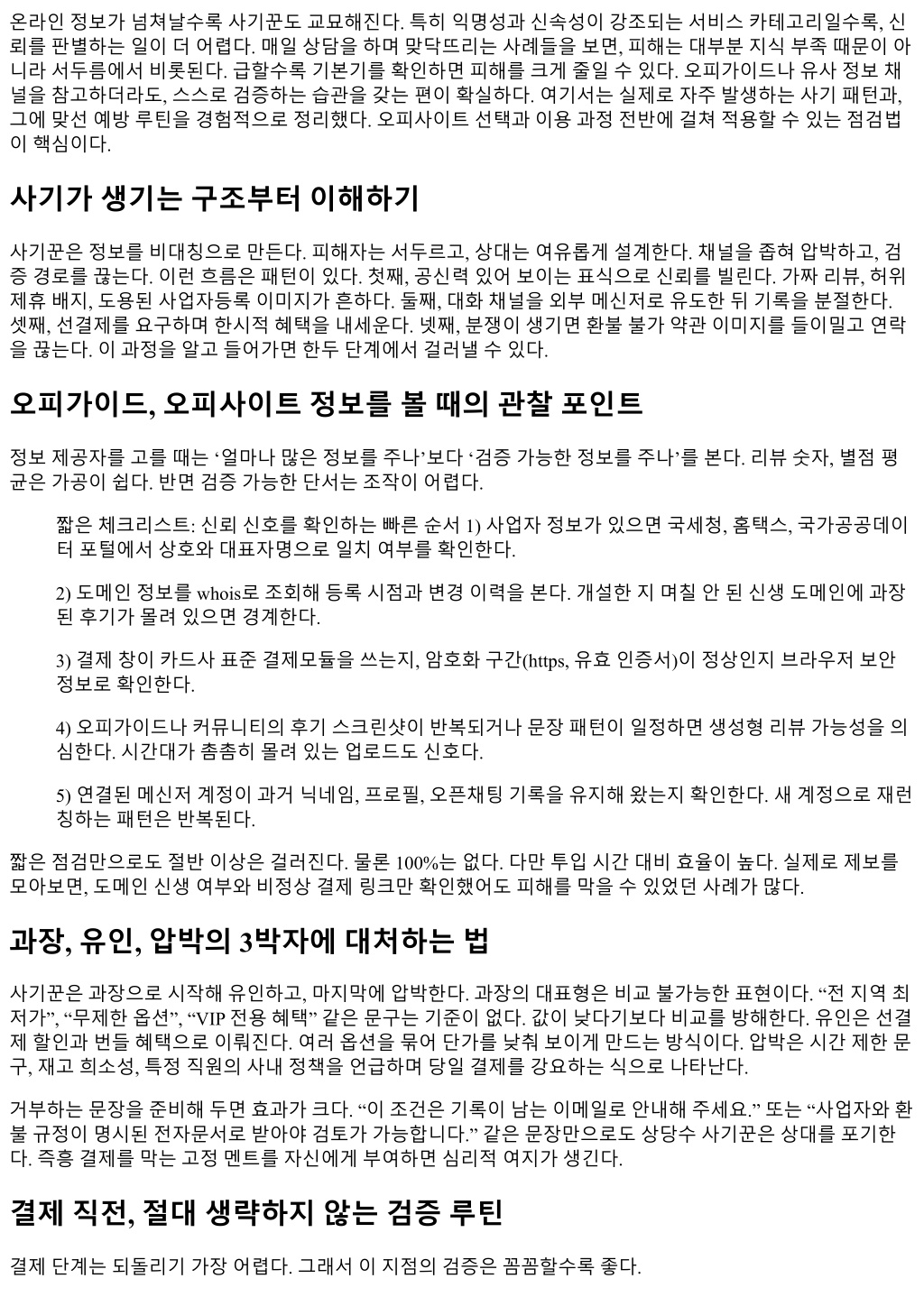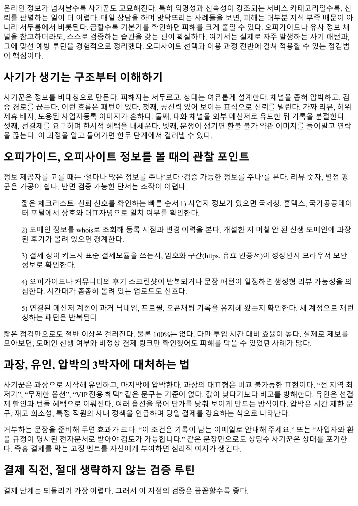 온라인정보가넘쳐날수록사기꾼도교묘해진다. 특히익명성과신속성이강조되는서비스카테고리일수록, 신 뢰를판별하는일이더어렵다. 매일상담을하며맞닥뜨리는사례들을보면, 피해는대부분지식부족때문이아 니라서두름에서비롯된다. 급할수록기본기를확인하면피해를크게줄일수있다. 오피가이드나유사정보채 널을참고하더라도, 스스로검증하는습관을갖는편이확실하다. 여기서는실제로자주발생하는사기패턴과, 그에맞선예방루틴을경험적으로정리했다. 오피사이트선택과이용과정전반에걸쳐적용할수있는점검법 이핵심이다. 사기가생기는구조부터이해하기 사기꾼은정보를비대칭으로만든다. 피해자는서두르고, 상대는여유롭게설계한다. 채널을좁혀압박하고, 검 증경로를끊는다. 이런흐름은패턴이있다. 첫째, 공신력있어보이는표식으로신뢰를빌린다. 가짜리뷰, 허위 제휴배지, 도용된사업자등록이미지가흔하다. 둘째, 대화채널을외부메신저로유도한뒤기록을분절한다. 셋째, 선결제를요구하며한시적혜택을내세운다. 넷째, 분쟁이생기면환불불가약관이미지를들이밀고연락 을끊는다. 이과정을알고들어가면한두단계에서걸러낼수있다. 오피가이드, 오피사이트정보를볼때의관찰포인트 정보제공자를고를때는 ‘얼마나많은정보를주나’보다 ‘검증가능한정보를주나’를본다. 리뷰숫자, 별점평 균은가공이쉽다. 반면검증가능한단서는조작이어렵다. 짧은체크리스트: 신뢰신호를확인하는빠른순서 1) 사업자정보가있으면국세청, 홈택스, 국가공공데이 터포털에서상호와대표자명으로일치여부를확인한다. 2) 도메인정보를 whois로조회해등록시점과변경이력을본다. 개설한지며칠안된신생도메인에과장 된후기가몰려있으면경계한다. 3) 결제창이카드사표준결제모듈을쓰는지, 암호화구간(https, 유효인증서)이정상인지브라우저보안 정보로확인한다. 4) 오피가이드나커뮤니티의후기스크린샷이반복되거나문장패턴이일정하면생성형리뷰가능성을의 심한다. 시간대가촘촘히몰려있는업로드도신호다. 5) 연결된메신저계정이과거닉네임, 프로필, 오픈채팅기록을유지해왔는지확인한다. 새계정으로재런 칭하는패턴은반복된다. 짧은점검만으로도절반이상은걸러진다. 물론 100%는없다. 다만투입시간대비효율이높다. 실제로제보를 모아보면, 도메인신생여부와비정상결제링크만확인했어도피해를막을수있었던사례가많다. 과장, 유인, 압박의 3박자에대처하는법 사기꾼은과장으로시작해유인하고, 마지막에압박한다. 과장의대표형은비교불가능한표현이다. “전지역최 저가”, “무제한옵션”, “VIP 전용혜택” 같은문구는기준이없다. 값이낮다기보다비교를방해한다. 유인은선결 제할인과번들혜택으로이뤄진다. 여러옵션을묶어단가를낮춰보이게만드는방식이다. 압박은시간제한문 구, 재고희소성, 특정직원의사내정책을언급하며당일결제를강요하는식으로나타난다. 거부하는문장을준비해두면효과가크다. “이조건은기록이남는이메일로안내해주세요.” 또는 “사업자와환 불규정이명시된전자문서로받아야검토가가능합니다.” 같은문장만으로도상당수사기꾼은상대를포기한 다. 즉흥결제를막는고정멘트를자신에게부여하면심리적여지가생긴다. 결제직전, 절대생략하지않는검증루틴 결제단계는되돌리기가장어렵다. 그래서이지점의검증은꼼꼼할수록좋다.