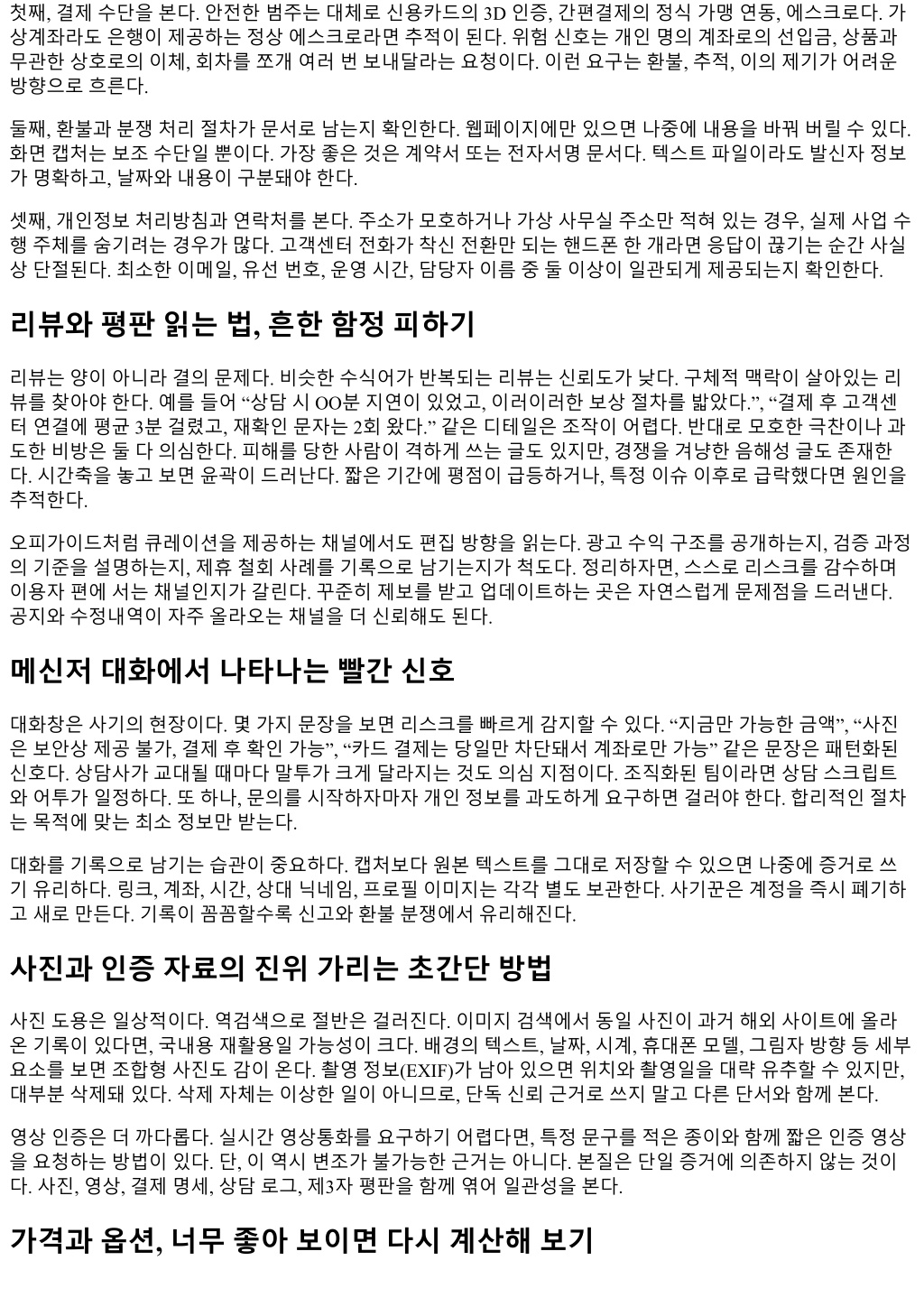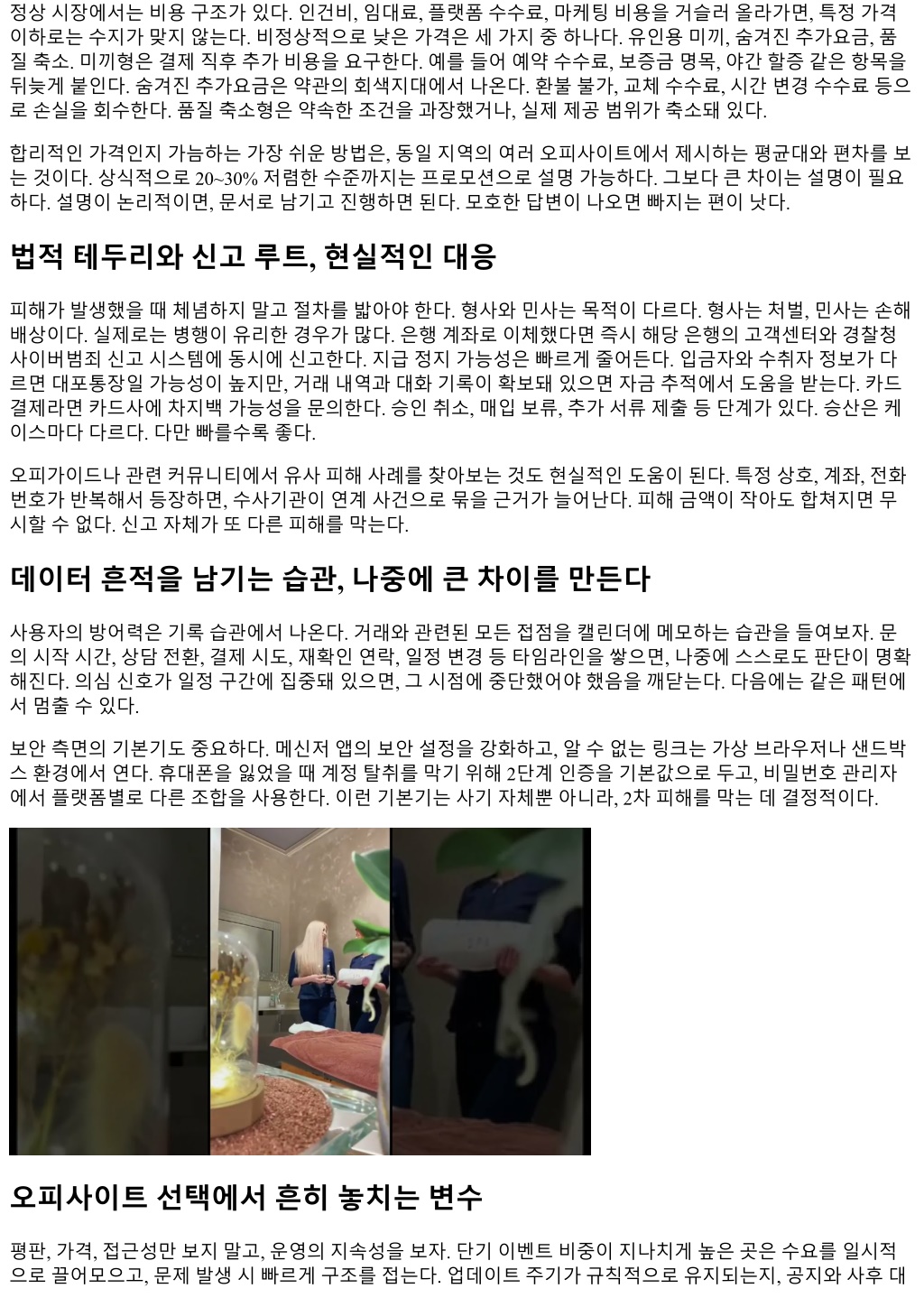 첫째, 결제수단을본다. 안전한범주는대체로신용카드의 3D 인증, 간편결제의정식가맹연동, 에스크로다. 가 상계좌라도은행이제공하는정상에스크로라면추적이된다. 위험신호는개인명의계좌로의선입금, 상품과 무관한상호로의이체, 회차를쪼개여러번보내달라는요청이다. 이런요구는환불, 추적, 이의제기가어려운 방향으로흐른다. 둘째, 환불과분쟁처리절차가문서로남는지확인한다. 웹페이지에만있으면나중에내용을바꿔버릴수있다. 화면캡처는보조수단일뿐이다. 가장좋은것은계약서또는전자서명문서다. 텍스트파일이라도발신자정보 가명확하고, 날짜와내용이구분돼야한다. 셋째, 개인정보처리방침과연락처를본다. 주소가모호하거나가상사무실주소만적혀있는경우, 실제사업수 행주체를숨기려는경우가많다. 고객센터전화가착신전환만되는핸드폰한개라면응답이끊기는순간사실 상단절된다. 최소한이메일, 유선번호, 운영시간, 담당자이름중둘이상이일관되게제공되는지확인한다. 리뷰와평판읽는법, 흔한함정피하기 리뷰는양이아니라결의문제다. 비슷한수식어가반복되는리뷰는신뢰도가낮다. 구체적맥락이살아있는리 뷰를찾아야한다. 예를들어 “상담시 OO분지연이있었고, 이러이러한보상절차를밟았다.”, “결제후고객센 터연결에평균 3분걸렸고, 재확인문자는 2회왔다.” 같은디테일은조작이어렵다. 반대로모호한극찬이나과 도한비방은둘다의심한다. 피해를당한사람이격하게쓰는글도있지만, 경쟁을겨냥한음해성글도존재한 다. 시간축을놓고보면윤곽이드러난다. 짧은기간에평점이급등하거나, 특정이슈이후로급락했다면원인을 추적한다. 오피가이드처럼큐레이션을제공하는채널에서도편집방향을읽는다. 광고수익구조를공개하는지, 검증과정 의기준을설명하는지, 제휴철회사례를기록으로남기는지가척도다. 정리하자면, 스스로리스크를감수하며 이용자편에서는채널인지가갈린다. 꾸준히제보를받고업데이트하는곳은자연스럽게문제점을드러낸다. 공지와수정내역이자주올라오는채널을더신뢰해도된다. 메신저대화에서나타나는빨간신호 대화창은사기의현장이다. 몇가지문장을보면리스크를빠르게감지할수있다. “지금만가능한금액”, “사진 은보안상제공불가, 결제후확인가능”, “카드결제는당일만차단돼서계좌로만가능” 같은문장은패턴화된 신호다. 상담사가교대될때마다말투가크게달라지는것도의심지점이다. 조직화된팀이라면상담스크립트 와어투가일정하다. 또하나, 문의를시작하자마자개인정보를과도하게요구하면걸러야한다. 합리적인절차 는목적에맞는최소정보만받는다. 대화를기록으로남기는습관이중요하다. 캡처보다원본텍스트를그대로저장할수있으면나중에증거로쓰 기유리하다. 링크, 계좌, 시간, 상대닉네임, 프로필이미지는각각별도보관한다. 사기꾼은계정을즉시폐기하 고새로만든다. 기록이꼼꼼할수록신고와환불분쟁에서유리해진다. 사진과인증자료의진위가리는초간단방법 사진도용은일상적이다. 역검색으로절반은걸러진다. 이미지검색에서동일사진이과거해외사이트에올라 온기록이있다면, 국내용재활용일가능성이크다. 배경의텍스트, 날짜, 시계, 휴대폰모델, 그림자방향등세부 요소를보면조합형사진도감이온다. 촬영정보(EXIF)가남아있으면위치와촬영일을대략유추할수있지만, 대부분삭제돼있다. 삭제자체는이상한일이아니므로, 단독신뢰근거로쓰지말고다른단서와함께본다. 영상인증은더까다롭다. 실시간영상통화를요구하기어렵다면, 특정문구를적은종이와함께짧은인증영상 을요청하는방법이있다. 단, 이역시변조가불가능한근거는아니다. 본질은단일증거에의존하지않는것이 다. 사진, 영상, 결제명세, 상담로그, 제3자평판을함께엮어일관성을본다. 가격과옵션, 너무좋아보이면다시계산해보기