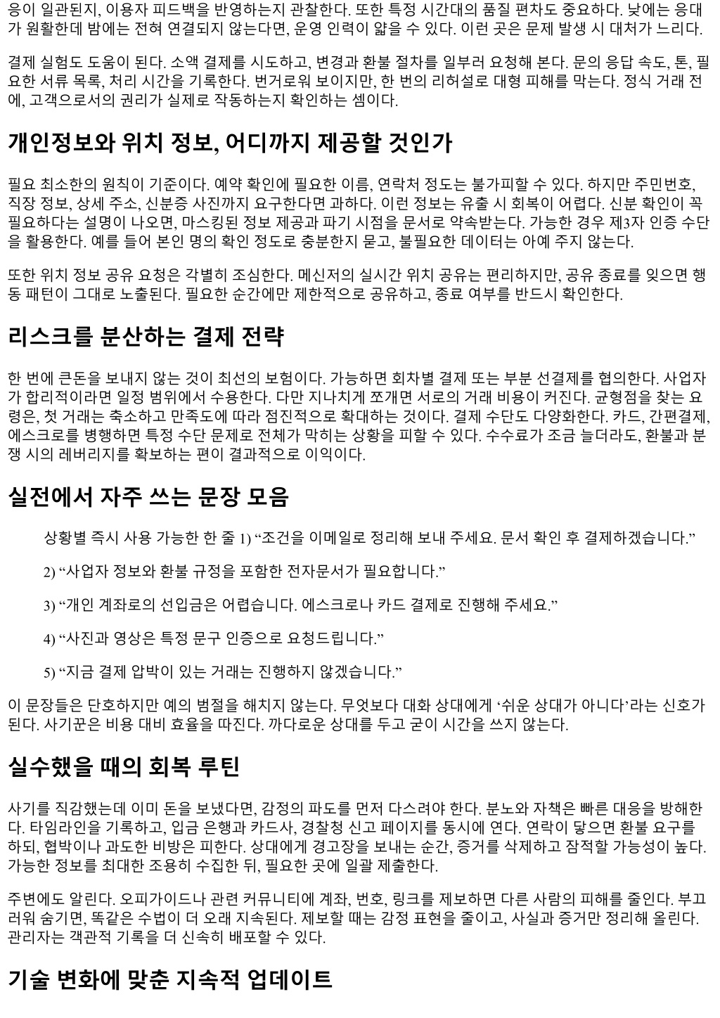응이일관된지, 이용자피드백을반영하는지관찰한다. 또한특정시간대의품질편차도중요하다. 낮에는응대 가원활한데밤에는전혀연결되지않는다면, 운영인력이얇을수있다. 이런곳은문제발생시대처가느리다. 결제실험도도움이된다. 소액결제를시도하고, 변경과환불절차를일부러요청해본다. 문의응답속도, 톤, 필 요한서류목록, 처리시간을기록한다. 번거로워보이지만, 한번의리허설로대형피해를막는다. 정식거래전 에, 고객으로서의권리가실제로작동하는지확인하는셈이다. 개인정보와위치정보, 어디까지제공할것인가 필요최소한의원칙이기준이다. 예약확인에필요한이름, 연락처정도는불가피할수있다. 하지만주민번호, 직장정보, 상세주소, 신분증사진까지요구한다면과하다. 이런정보는유출시회복이어렵다. 신분확인이꼭 필요하다는설명이나오면, 마스킹된정보제공과파기시점을문서로약속받는다. 가능한경우제3자인증수단 을활용한다. 예를들어본인명의확인정도로충분한지묻고, 불필요한데이터는아예주지않는다. 또한위치정보공유요청은각별히조심한다. 메신저의실시간위치공유는편리하지만, 공유종료를잊으면행 동패턴이그대로노출된다. 필요한순간에만제한적으로공유하고, 종료여부를반드시확인한다. 리스크를분산하는결제전략 한번에큰돈을보내지않는것이최선의보험이다. 가능하면회차별결제또는부분선결제를협의한다. 사업자 가합리적이라면일정범위에서수용한다. 다만지나치게쪼개면서로의거래비용이커진다. 균형점을찾는요 령은, 첫거래는축소하고만족도에따라점진적으로확대하는것이다. 결제수단도다양화한다. 카드, 간편결제, 에스크로를병행하면특정수단문제로전체가막히는상황을피할수있다. 수수료가조금늘더라도, 환불과분 쟁시의레버리지를확보하는편이결과적으로이익이다. 실전에서자주쓰는문장모음 상황별즉시사용가능한한줄 1) “조건을이메일로정리해보내주세요. 문서확인후결제하겠습니다.” 2) “사업자정보와환불규정을포함한전자문서가필요합니다.” 3) “개인계좌로의선입금은어렵습니다. 에스크로나카드결제로진행해주세요.” 4) “사진과영상은특정문구인증으로요청드립니다.” 5) “지금결제압박이있는거래는진행하지않겠습니다.” 이문장들은단호하지만예의범절을해치지않는다. 무엇보다대화상대에게 ‘쉬운상대가아니다’라는신호가 된다. 사기꾼은비용대비효율을따진다. 까다로운상대를두고굳이시간을쓰지않는다. 실수했을때의회복루틴 사기를직감했는데이미돈을보냈다면, 감정의파도를먼저다스려야한다. 분노와자책은빠른대응을방해한 다. 타임라인을기록하고, 입금은행과카드사, 경찰청신고페이지를동시에연다. 연락이닿으면환불요구를 하되, 협박이나과도한비방은피한다. 상대에게경고장을보내는순간, 증거를삭제하고잠적할가능성이높다. 가능한정보를최대한조용히수집한뒤, 필요한곳에일괄제출한다. 주변에도알린다. 오피가이드나관련커뮤니티에계좌, 번호, 링크를제보하면다른사람의피해를줄인다. 부끄 러워숨기면, 똑같은수법이더오래지속된다. 제보할때는감정표현을줄이고, 사실과증거만정리해올린다. 관리자는객관적기록을더신속히배포할수있다. 기술변화에맞춘지속적업데이트