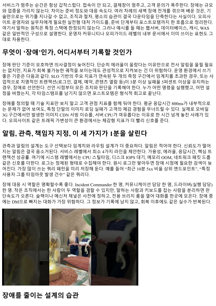 서비스가멈추는순간은항상갑작스럽다. 접속이안되고, 결제창이멈추고, 고객문의가폭주한다. 장애는규모 와업종을가리지않는다. 차이는준비정도와대응속도다. 여러차례의새벽장애전개를겪으며배운것은, 기 술만으로는위기를지나갈수없고, 조직과절차, 평소의습관이결국다운타임을단축한다는사실이다. 오피사 이트운영자와실무자에게필요한실전형대처가이드를, 준비단계부터포스트모템까지한호흡으로정리한다. 여기서말하는원칙은특정스택에한정되지않는다. 그러나예시를들때는웹서버, 데이터베이스, 캐시, WAS 같은일반적인구성으로설명한다. 운영자커뮤니티나오피가이드레벨의내부문서에서이미쓰이는표현도그 대로차용한다. 무엇이 ‘장애’인가, 어디서부터기록할것인가 장애판단기준이모호하면의사결정이늦어진다. 단순히에러율이올랐다는이유만으로전사알림을울릴필요 는없지만, 지표가회복불가능한궤적을보이는데도관성적으로지켜보는건더위험하다. 운영환경에서쓰기 좋은기준은다음과같다. SLO 기반의주요지표가연속된두개의측정구간에서임계치를초과한경우, 또는사 업적으로치명적인트랜잭션(로그인, 결제, 예약, 콘텐츠열람등)이 3분이상실패율 5퍼센트이상을유지하는 경우, 장애로선언한다. 선언시점부터모든조치와판단을기록해야한다. 누가어떤명령을실행했고, 어떤설 정을바꿨는지, 각타임스탬프를남기지않으면포스트모템은형식적회고로끝난다. 장애를정의할때기술지표만보지말고고객관점지표를함께둬야한다. 평균응답시간 800ms가내부적으로 는문제가없어보여도, 특정단말의이미지로딩실패가고객의체감경험을무너뜨릴수있다. 실제로모바일 3G 구간에서만발생한이미지 CDN 서빙이슈를, 서버 CPU가여유롭다는이유로한시간넘게놓친사례가있 다. 오피사이트같은트래픽가변성이큰환경에서는체감형지표가더빨리신호를준다. 알림, 관측, 책임자지정, 이세가지가 1분을살린다 관측과알림의설계는도구선택보다임계치와라우팅설계가더중요하다. 알림은적어야한다. 신뢰도가떨어 지는알림은결국음소거된다. 서비스레벨에서최소 4가지라인을제안한다. 가용성, 에러율, 응답시간, 핵심트 랜잭션성공률. 여기에시스템레벨에서는 CPU 스틸타임, 디스크 IOPS 대기, 메모리 OOM, 네트워크패킷드롭 같은신호를더한다. 로그는정제된형태로수집해야한다. 원시로그만쌓아두면장애시점에필요한검색이늦 어진다. 가장많이쓰는쿼리패턴을미리저장해둔다. 예를들어 “최근 10분 5xx 비율상위엔드포인트”, “특정 사용자그룹타임아웃발생건수” 같은쿼리다. 장애대응시역할은명확할수록좋다. Incident Commander 한명, 커뮤니케이션담당한명, 드라이버(실행담당) 한명. 작은조직에서는한사람이두역할을겸할수있지만, 말하는사람과키보드를잡는사람을분리하면판 단속도가오른다. 슬랙이나메신저채널은사전에정하고, 전용브리지룸을열어대화를한곳에모은다. 장애중 에는 DM으로빠지는대화가가장위험하다. 그정보가기록에남지않고, 회복이후에도같은실수가반복된다. 장애를줄이는설계의습관