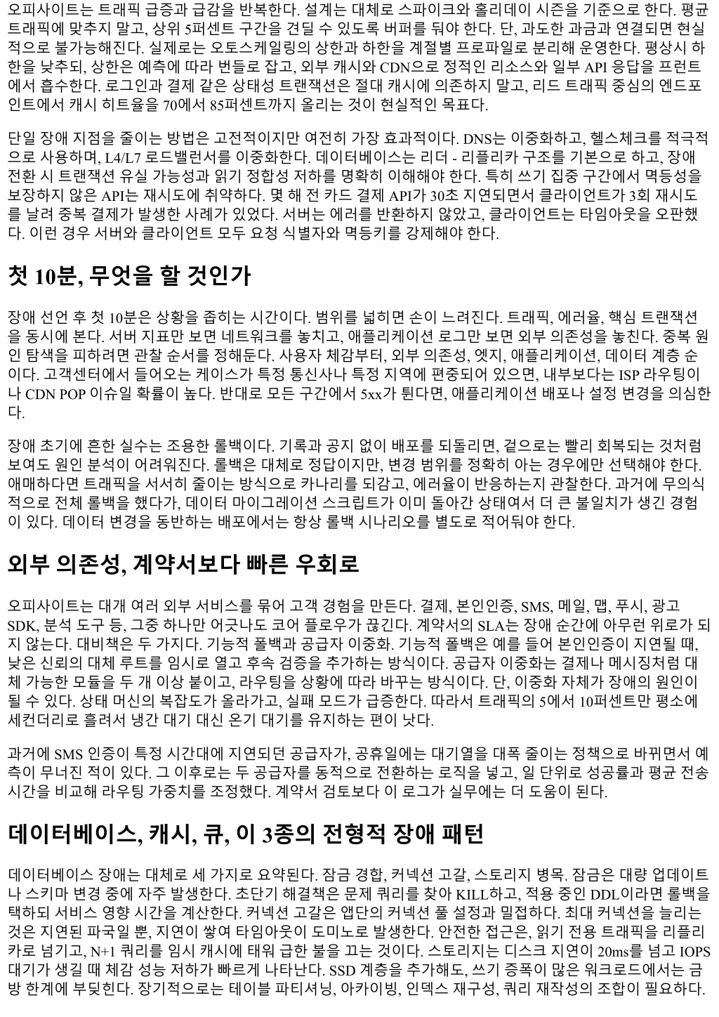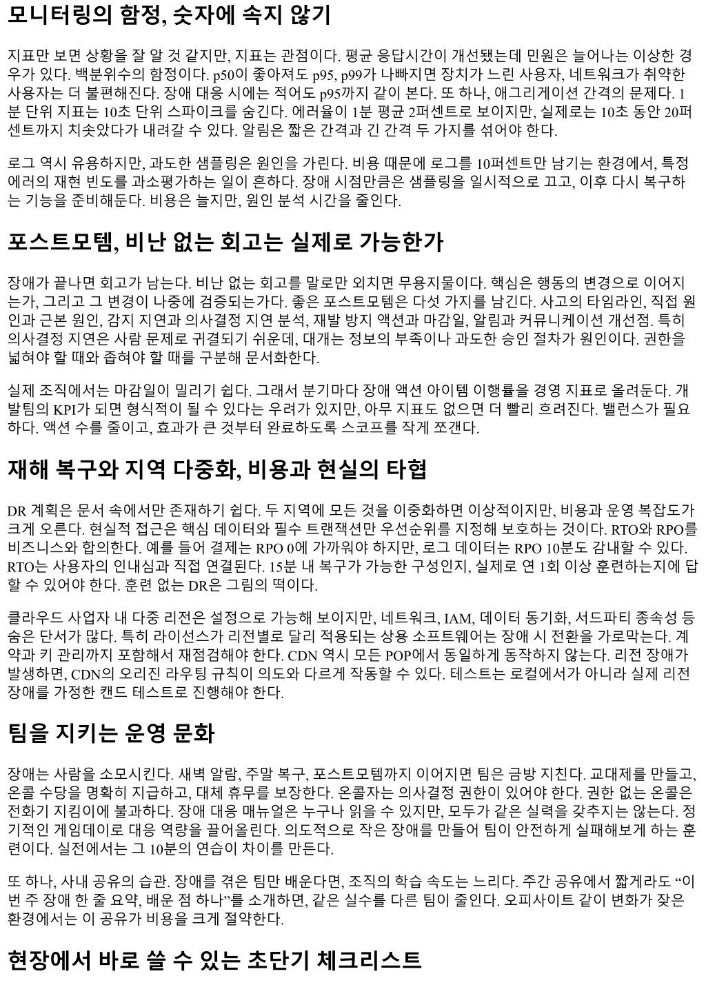 모니터링의함정, 숫자에속지않기 지표만보면상황을잘알것같지만, 지표는관점이다. 평균응답시간이개선됐는데민원은늘어나는이상한경 우가있다. 백분위수의함정이다. p50이좋아져도 p95, p99가나빠지면장치가느린사용자, 네트워크가취약한 사용자는더불편해진다. 장애대응시에는적어도 p95까지같이본다. 또하나, 애그리게이션간격의문제다. 1 분단위지표는 10초단위스파이크를숨긴다. 에러율이 1분평균 2퍼센트로보이지만, 실제로는 10초동안 20퍼 센트까지치솟았다가내려갈수있다. 알림은짧은간격과긴간격두가지를섞어야한다. 로그역시유용하지만, 과도한샘플링은원인을가린다. 비용때문에로그를 10퍼센트만남기는환경에서, 특정 에러의재현빈도를과소평가하는일이흔하다. 장애시점만큼은샘플링을일시적으로끄고, 이후다시복구하 는기능을준비해둔다. 비용은늘지만, 원인분석시간을줄인다. 포스트모템, 비난없는회고는실제로가능한가 장애가끝나면회고가남는다. 비난없는회고를말로만외치면무용지물이다. 핵심은행동의변경으로이어지 는가, 그리고그변경이나중에검증되는가다. 좋은포스트모템은다섯가지를남긴다. 사고의타임라인, 직접원 인과근본원인, 감지지연과의사결정지연분석, 재발방지액션과마감일, 알림과커뮤니케이션개선점. 특히 의사결정지연은사람문제로귀결되기쉬운데, 대개는정보의부족이나과도한승인절차가원인이다. 권한을 넓혀야할때와좁혀야할때를구분해문서화한다. 실제조직에서는마감일이밀리기쉽다. 그래서분기마다장애액션아이템이행률을경영지표로올려둔다. 개 발팀의 KPI가되면형식적이될수있다는우려가있지만, 아무지표도없으면더빨리흐려진다. 밸런스가필요 하다. 액션수를줄이고, 효과가큰것부터완료하도록스코프를작게쪼갠다. 재해복구와지역다중화, 비용과현실의타협 DR 계획은문서속에서만존재하기쉽다. 두지역에모든것을이중화하면이상적이지만, 비용과운영복잡도가 크게오른다. 현실적접근은핵심데이터와필수트랜잭션만우선순위를지정해보호하는것이다. RTO와 RPO를 비즈니스와합의한다. 예를들어결제는 RPO 0에가까워야하지만, 로그데이터는 RPO 10분도감내할수있다. RTO는사용자의인내심과직접연결된다. 15분내복구가가능한구성인지, 실제로연 1회이상훈련하는지에답 할수있어야한다. 훈련없는 DR은그림의떡이다. 클라우드사업자내다중리전은설정으로가능해보이지만, 네트워크, IAM, 데이터동기화, 서드파티종속성등 숨은단서가많다. 특히라이선스가리전별로달리적용되는상용소프트웨어는장애시전환을가로막는다. 계 약과키관리까지포함해서재점검해야한다. CDN 역시모든 POP에서동일하게동작하지않는다. 리전장애가 발생하면, CDN의오리진라우팅규칙이의도와다르게작동할수있다. 테스트는로컬에서가아니라실제리전 장애를가정한캔드테스트로진행해야한다. 팀을지키는운영문화 장애는사람을소모시킨다. 새벽알람, 주말복구, 포스트모템까지이어지면팀은금방지친다. 교대제를만들고, 온콜수당을명확히지급하고, 대체휴무를보장한다. 온콜자는의사결정권한이있어야한다. 권한없는온콜은 전화기지킴이에불과하다. 장애대응매뉴얼은누구나읽을수있지만, 모두가같은실력을갖추지는않는다. 정 기적인게임데이로대응역량을끌어올린다. 의도적으로작은장애를만들어팀이안전하게실패해보게하는훈 련이다. 실전에서는그 10분의연습이차이를만든다. 또하나, 사내공유의습관. 장애를겪은팀만배운다면, 조직의학습속도는느리다. 주간공유에서짧게라도 “이 번주장애한줄요약, 배운점하나”를소개하면, 같은실수를다른팀이줄인다. 오피사이트같이변화가잦은 환경에서는이공유가비용을크게절약한다. 현장에서바로쓸수있는초단기체크리스트
