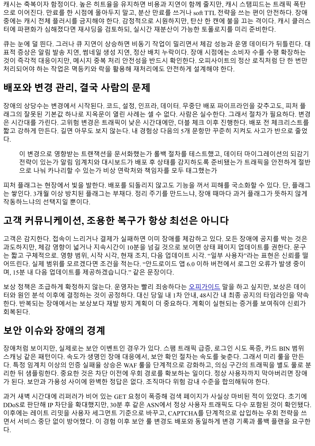 캐시는축복이자함정이다. 높은히트율을유지하면비용과지연이함께줄지만, 캐시스탬피드는트래픽폭탄 으로이어진다. 만료를한시점에몰아두지말고, 분산만료를쓰거나 soft TTL 전략을쓰는편이안전하다. 장애 중에는캐시전체플러시를금지해야한다. 감정적으로시원하지만, 탄산한캔에불을끄는격이다. 캐시클러스 터에파편화가심해졌다면재샤딩을검토하되, 실시간재분산이가능한토폴로지를미리준비한다. 큐는눈에덜띈다. 그러나큐지연이상승하면비동기작업이밀리면서체감성능과운영데이터가뒤틀린다. 대 표적증상은알림발송지연, 썸네일생성지연, 정산배치누락이다. 장애시점에는소비자수를수평확장하는 것이즉각적대응이지만, 메시지중복처리안전성을반드시확인한다. 오피사이트의정산로직처럼단한번만 처리되어야하는작업은멱등키와락을활용해재처리에도안전하게설계해야한다. 배포와변경관리, 결국사람의문제 장애의상당수는변경에서시작된다. 코드, 설정, 인프라, 데이터. 무중단배포파이프라인을갖추고도, 피처플 래그의잘못된기본값하나로지옥문이열린사례는셀수없다. 사람은실수한다. 그래서절차가필요하다. 변경 은시간대를가린다. 고위험변경은트래픽이낮은시간대에만, 더블체크이후진행한다. 배포전체크리스트를 짧고강하게만든다. 길면아무도보지않는다. 내경험상다음의 5개문항만꾸준히지켜도사고가반으로줄었 다. 이변경으로영향받는트랜잭션을문서화했는가롤백절차를테스트했고, 데이터마이그레이션의되감기 전략이있는가알림임계치와대시보드가배포후상태를감지하도록준비됐는가트래픽을안전하게절반 으로나눠카나리할수있는가비상연락처와책임자를모두태그했는가 피처플래그는현장에서빛을발한다. 배포를되돌리지않고도기능을꺼서피해를국소화할수있다. 단, 플래그 는쌓인다. 3개월이상방치된플래그는부채다. 정리주기를만드느냐, 장애때마다과거플래그가뜻하지않게 작동하느냐의선택지일뿐이다. 고객커뮤니케이션, 조용한복구가항상최선은아니다 고객은감지한다. 접속이느리거나결제가실패하면이미장애를체감하고있다. 모든장애에공지를박는것은 과도하지만, 체감영향이넓거나지속시간이 10분을넘길것으로보이면상태페이지업데이트를권한다. 문구 는짧고구체적으로. 영향범위, 시작시각, 현재조치, 다음업데이트시각. “일부사용자”라는표현은신뢰를떨 어뜨린다. 실제범위를모르겠다면조건을적는다. “안드로이드앱 6.0 이하버전에서로그인오류가발생중이 며, 15분내다음업데이트를제공하겠습니다.” 같은문장이다. 보상정책은조급하게확정하지않는다. 운영자는빨리죄송하다는오피가이드말을하고싶지만, 보상은데이 터와원인분석이후에결정하는것이공정하다. 대신당일내 1차안내, 48시간내최종공지의타임라인을약속 한다. 반복되는장애에서는보상보다재발방지계획이더중요하다. 계획이실현되는증거를보여줘야신뢰가 회복된다. 보안이슈와장애의경계 장애처럼보이지만, 실제로는보안이벤트인경우가있다. 스팸트래픽급증, 로그인시도폭증, 카드 BIN 범위 스캐닝같은패턴이다. 속도가생명인장애대응에서, 보안확인절차는속도를늦춘다. 그래서미리룰을만든 다. 특정임계치이상의인증실패율상승은 WAF 룰을단계적으로강화하고, 의심구간의트래픽을별도풀로분 리한뒤샘플링한다. 중요한것은차단이전에우회경로를확보하는일이다. 정상사용자까지막아버리면장애 가된다. 보안과가용성사이에완벽한정답은없다. 조직마다위험감내수준을합의해둬야한다. 과거새벽시간대에리퍼러가비어있는 GET 요청이폭증해검색페이지가사실상마비된적이있었다. 초기에 DDoS로판단해 IP 차단을확대했지만, 30분후같은 ASN에서정상사용자트래픽도다수포함된것이확인됐다. 이후에는레이트리밋을사용자세그먼트기준으로바꾸고, CAPTCHA를단계적으로삽입하는우회전략을쓰 면서서비스중단없이방어했다. 이경험이후보안룰변경도배포와동일하게변경기록과롤백플랜을요구한 다.