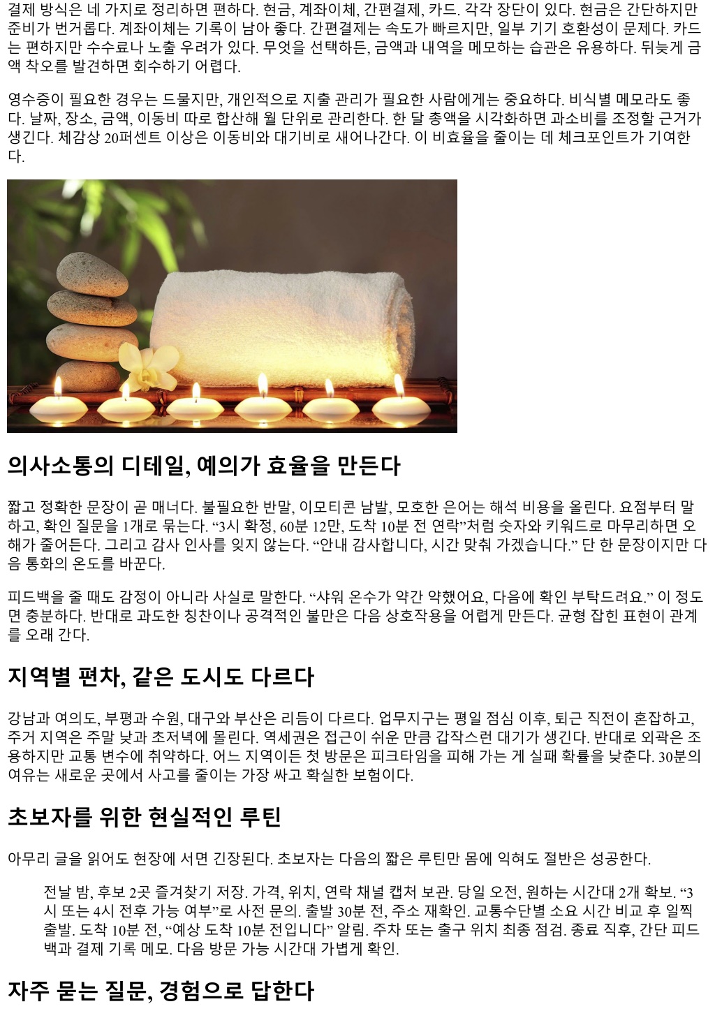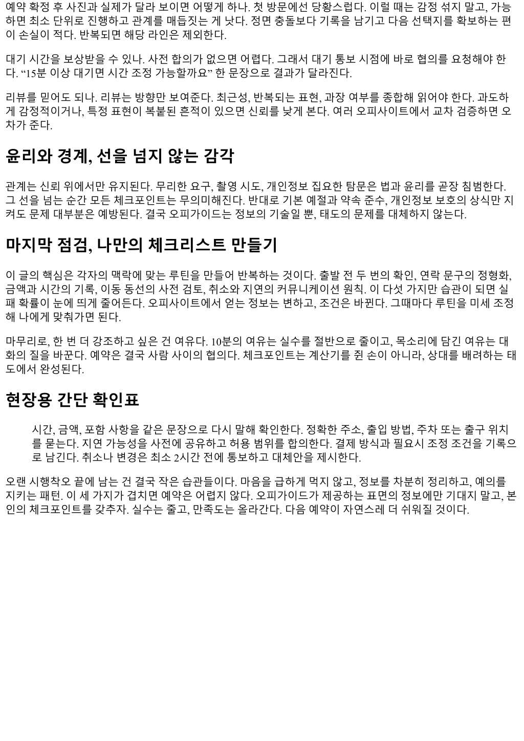 결제방식은네가지로정리하면편하다. 현금, 계좌이체, 간편결제, 카드. 각각장단이있다. 현금은간단하지만 준비가번거롭다. 계좌이체는기록이남아좋다. 간편결제는속도가빠르지만, 일부기기호환성이문제다. 카드 는편하지만수수료나노출우려가있다. 무엇을선택하든, 금액과내역을메모하는습관은유용하다. 뒤늦게금 액착오를발견하면회수하기어렵다. 영수증이필요한경우는드물지만, 개인적으로지출관리가필요한사람에게는중요하다. 비식별메모라도좋 다. 날짜, 장소, 금액, 이동비따로합산해월단위로관리한다. 한달총액을시각화하면과소비를조정할근거가 생긴다. 체감상 20퍼센트이상은이동비와대기비로새어나간다. 이비효율을줄이는데체크포인트가기여한 다. 의사소통의디테일, 예의가효율을만든다 짧고정확한문장이곧매너다. 불필요한반말, 이모티콘남발, 모호한은어는해석비용을올린다. 요점부터말 하고, 확인질문을 1개로묶는다. “3시확정, 60분 12만, 도착 10분전연락”처럼숫자와키워드로마무리하면오 해가줄어든다. 그리고감사인사를잊지않는다. “안내감사합니다, 시간맞춰가겠습니다.” 단한문장이지만다 음통화의온도를바꾼다. 피드백을줄때도감정이아니라사실로말한다. “샤워온수가약간약했어요, 다음에확인부탁드려요.” 이정도 면충분하다. 반대로과도한칭찬이나공격적인불만은다음상호작용을어렵게만든다. 균형잡힌표현이관계 를오래간다. 지역별편차, 같은도시도다르다 강남과여의도, 부평과수원, 대구와부산은리듬이다르다. 업무지구는평일점심이후, 퇴근직전이혼잡하고, 주거지역은주말낮과초저녁에몰린다. 역세권은접근이쉬운만큼갑작스런대기가생긴다. 반대로외곽은조 용하지만교통변수에취약하다. 어느지역이든첫방문은피크타임을피해가는게실패확률을낮춘다. 30분의 여유는새로운곳에서사고를줄이는가장싸고확실한보험이다. 초보자를위한현실적인루틴 아무리글을읽어도현장에서면긴장된다. 초보자는다음의짧은루틴만몸에익혀도절반은성공한다. 전날밤, 후보 2곳즐겨찾기저장. 가격, 위치, 연락채널캡처보관. 당일오전, 원하는시간대 2개확보. “3 시또는 4시전후가능여부”로사전문의. 출발 30분전, 주소재확인. 교통수단별소요시간비교후일찍 출발. 도착 10분전, “예상도착 10분전입니다” 알림. 주차또는출구위치최종점검. 종료직후, 간단피드 백과결제기록메모. 다음방문가능시간대가볍게확인. 자주묻는질문, 경험으로답한다