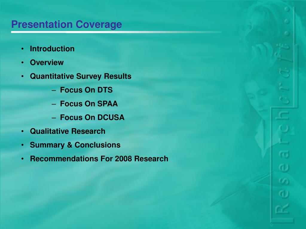 Presentation Coverage • Introduction • Overview • Quantitative Survey Results • Focus On DTS • Focus On SPAA • Focus On DCUSA • Qualitative Research • Summary & Conclusions • Recommendations For 2008 Research