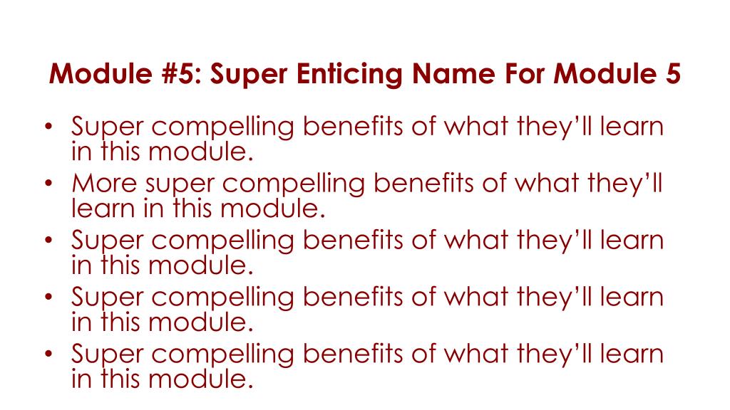 Module #5: Super Enticing Name For Module 5 • Super compelling benefits of what they’ll learn in this module. • More super compelling benefits of what they’ll learn in this module. • Super compelling benefits of what they’ll learn in this module. • Super compelling benefits of what they’ll learn in this module. • Super compelling benefits of what they’ll learn in this module.