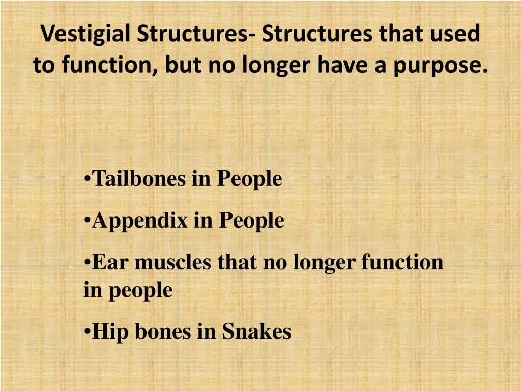 Vestigial Structures- Structures that used to function, but no longer have a purpose. • Tailbones in People • Appendix in People • Ear muscles that no longer function in people • Hip bones in Snakes