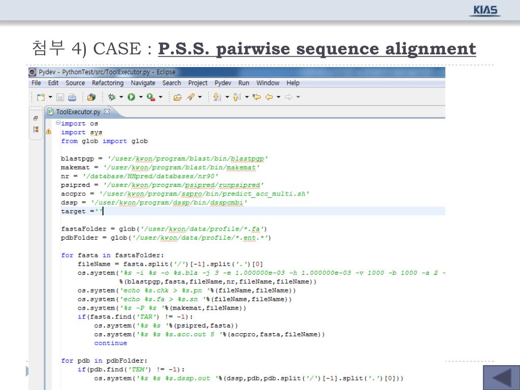 CASE : P.S.S. pairwise sequence alignment • BioInformatics 실험 절차(계속) • Profile/Secondary/Solvent 각각의 correlationship matrix 생성 • 각 matrix에 서로 다른 가중치를 곱하여 통합된 PSS substitution matrix 생성 • Terminal gap/gap open/gap extend penalty값 설정 • Pairwise alignment 실행하여 score 계산 • 모든 대상 template의 score를 정렬하여 structure alignment한 결과와 유사성을 계산 • 가중치를 변화하여 유사성이 높은 가중치 패턴 검색 Profile Correlation Matrix Secondary Structure Correlation Matrix Solvent Accessibility Correlation Matrix Weight(I) Weight(II) Weight(III) PSS Substitution Matrix