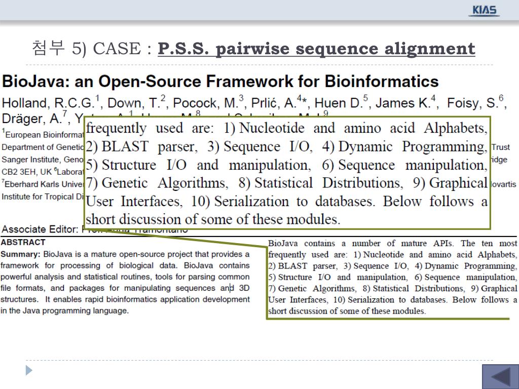 Overview • Objective • BioInformatics를 쉽고 편리하게 개발할 수 있는 방법 제시 • Approach • BioInformatics 사례를 통한 프로그램 개발 방법 설명 : Profile/Secondary Structure/Solvent Accessibility 를 이용한 sequence-alignment 프로그램 • 개발절차와 구현 예 제시 • BioJava, Apache Commons 툴 소개 • BioInformatics 개발 방법 제시