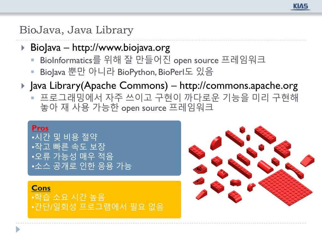 BioJava, Java Library • BioJava – http://www.biojava.org • BioInformatics를 위해 잘 만들어진 open source 프레임워크 • BioJava 뿐만 아니라 BioPython, BioPerl도 있음 • Java Library(Apache Commons) – http://commons.apache.org • 프로그래밍에서 자주 쓰이고 구현이 까다로운 기능을 미리 구현해 놓아 재 사용 가능한 open source 프레임워크 • Pros • 시간 및 비용 절약 • 작고 빠른 속도 보장 • 오류 가능성 매우 적음 • 소스 공개로 인한 응용 가능 • Cons • 학습 소요 시간 높음 • 간단/일회성 프로그램에서 필요 없음