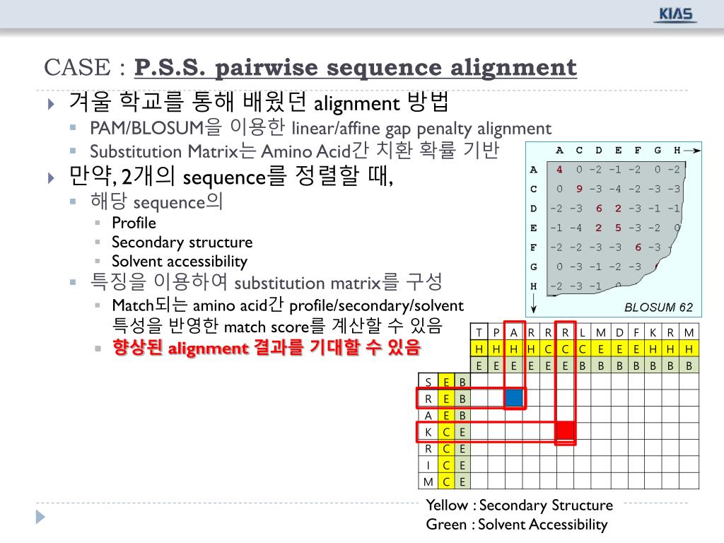 CASE : P.S.S. pairwise sequence alignment • 겨울 학교를 통해 배웠던 alignment 방법 • PAM/BLOSUM을 이용한 linear/affine gap penalty alignment • Substitution Matrix는 Amino Acid간 치환 확률 기반 • 만약, 2개의 sequence를 정렬할 때, • 해당 sequence의 • Profile • Secondary structure • Solvent accessibility • 특징을 이용하여 substitution matrix를 구성 • Match되는 amino acid간 profile/secondary/solvent 특성을 반영한 match score를 계산할 수 있음 • 향상된 alignment 결과를 기대할 수 있음 Yellow : Secondary Structure Green : Solvent Accessibility