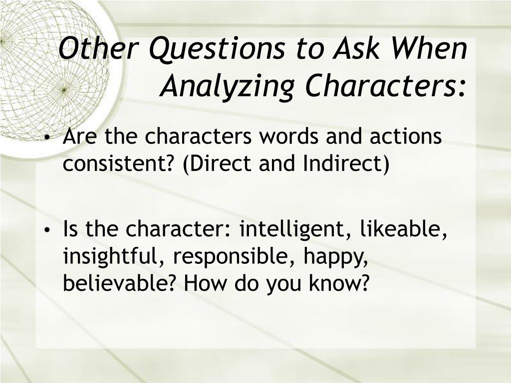 Other Questions to Ask When Analyzing Characters: • Are the characters words and actions consistent? (Direct and Indirect) • Is the character: intelligent, likeable, insightful, responsible, happy, believable? How do you know?