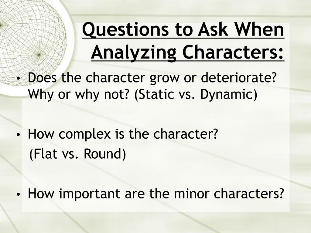 Questions to Ask When Analyzing Characters: • Does the character grow or deteriorate? Why or why not? (Static vs. Dynamic) • How complex is the character? (Flat vs. Round) • How important are the minor characters?