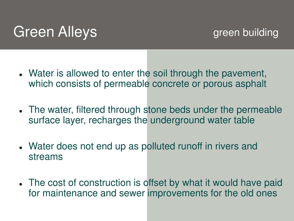 Green Alleys green building • Water is allowed to enter the soil through the pavement, which consists of permeable concrete or porous asphalt • The water, filtered through stone beds under the permeable surface layer, recharges the underground water table • Water does not end up as polluted runoff in rivers and streams • The cost of construction is offset by what it would have paid for maintenance and sewer improvements for the old ones