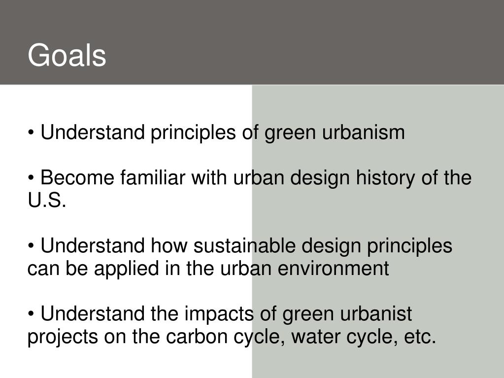 Goals • Understand principles of green urbanism •Become familiar with urban design history of the U.S. •Understand how sustainable design principles can be applied in the urban environment • Understand the impacts of green urbanist projects on the carbon cycle, water cycle, etc.