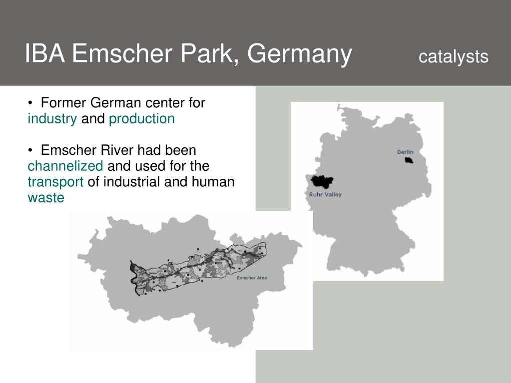 IBA Emscher Park, Germany catalysts • Former German center for industry and production • Emscher River had been channelized and used for the transport of industrial and human waste