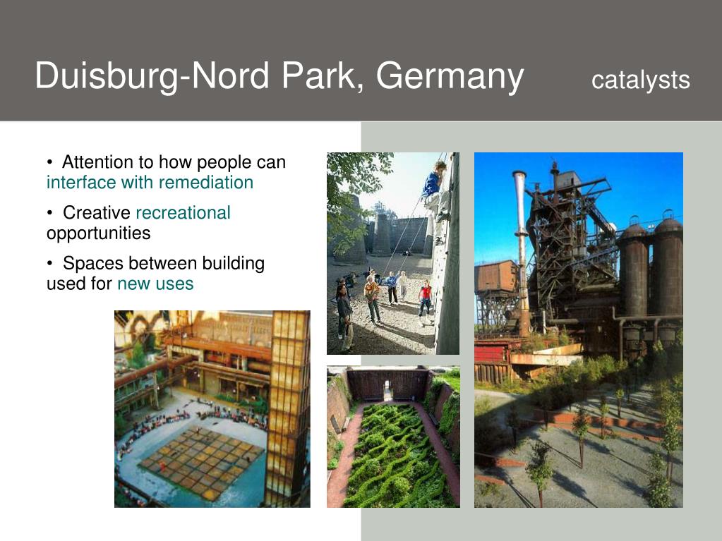 Duisburg-Nord Park, Germany catalysts • Attention to how people can interface with remediation • Creative recreational opportunities • Spaces between building used for new uses