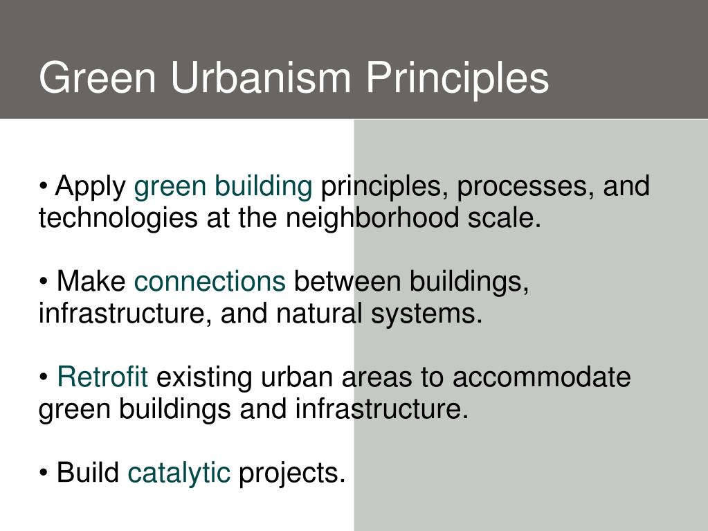 Green Urbanism Principles • Apply green building principles, processes, and technologies at the neighborhood scale. •Make connections betweenbuildings, infrastructure, and natural systems. • Retrofitexisting urban areas to accommodate green buildings and infrastructure. • Build catalytic projects.