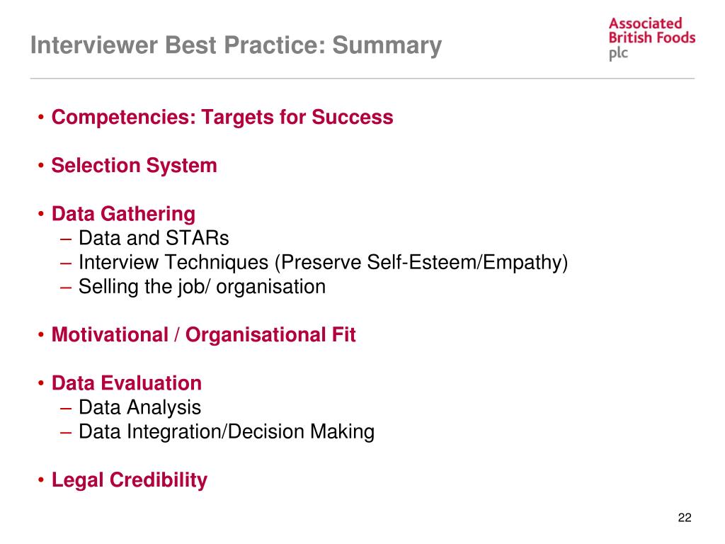 Interviewer Best Practice: Summary • Competencies: Targets for Success • Selection System • Data Gathering • Data and STARs • Interview Techniques (Preserve Self-Esteem/Empathy) • Selling the job/ organisation • Motivational / Organisational Fit • Data Evaluation • Data Analysis • Data Integration/Decision Making • Legal Credibility