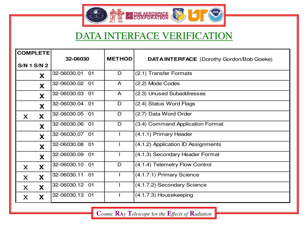 PAIP Compliance • Reliability Analysis Submitted to GSFC • Parts Stress Analyses Analysis Submitted to GSFC • Failure Modes and Effects Analysis Analysis Submitted to GSFC • Critical Items List Submitted to GSFC • Parts Stress Analyses Analysis Submitted to GSFC • Reliability Assessments Submitted to GSFC • Analysis of test Data Trend Analysis submitted; MGH & BNL results presented • Software Assurance CRaTER does not employ any flight software • Ground Data System Requirements CRaTER and LRO Ground Data Systems are compatible • Risk Management Requirements Analysis Submitted to GSFC • Integrated Independent Review Requirements Peer reviews on Electrical, Mechanical, and FPGA • GSFC System Review Requirements PDR, CDR, PER, and PSR conducted by NASA IRT • Performance and Environmental Verification Plan Submitted to GSFC • Performance Verification Matrix Submitted to GSFC • Environmental Test Matrix (ETM) Submitted to GSFC • Verification Procedures Submitted to GSFC • Instrument Verification Reports 89 required; 83 completed • Structural & Mechanical Requirements Analysis and Environmental tests demonstrate safety margins • Electromagnetic Compatibility (EMC) Requirements Tests perform at Chomerics in Woburn, MA • Vacuum, Thermal and Humidity Requirements Thermal balance and Thermal vacuum tests were successful • Workmanship All certified per NASA STD 8739.X • New/Advanced Packaging Technology No advanced packaging employed