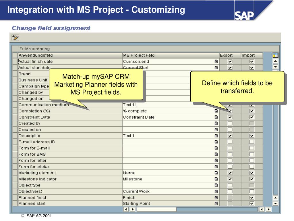 Integration with MS Project - Customizing Match-up mySAP CRM Marketing Planner fields with MS Project fields. Define which fields to be transferred.