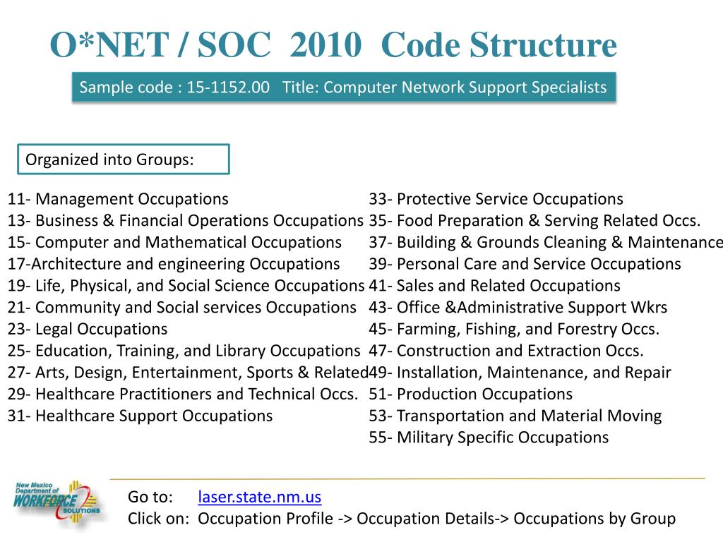 O*NET / SOC 2010 Code Structure Sample code : 15-1152.00 Title: Computer Network Support Specialists Organized into Groups: 11- Management Occupations 13- Business & Financial Operations Occupations 15- Computer and Mathematical Occupations 17-Architecture and engineering Occupations 19- Life, Physical, and Social Science Occupations 21- Community and Social services Occupations 23- Legal Occupations 25- Education, Training, and Library Occupations 27- Arts, Design, Entertainment, Sports & Related 29- Healthcare Practitioners and Technical Occs. 31- Healthcare Support Occupations 33- Protective Service Occupations 35- Food Preparation & Serving Related Occs. 37- Building & Grounds Cleaning & Maintenance 39- Personal Care and Service Occupations 41- Sales and Related Occupations 43- Office &Administrative Support Wkrs 45- Farming, Fishing, and Forestry Occs. 47- Construction and Extraction Occs. 49- Installation, Maintenance, and Repair 51- Production Occupations 53- Transportation and Material Moving 55- Military Specific Occupations Go to: laser.state.nm.us Click on: Occupation Profile -> Occupation Details-> Occupations by Group