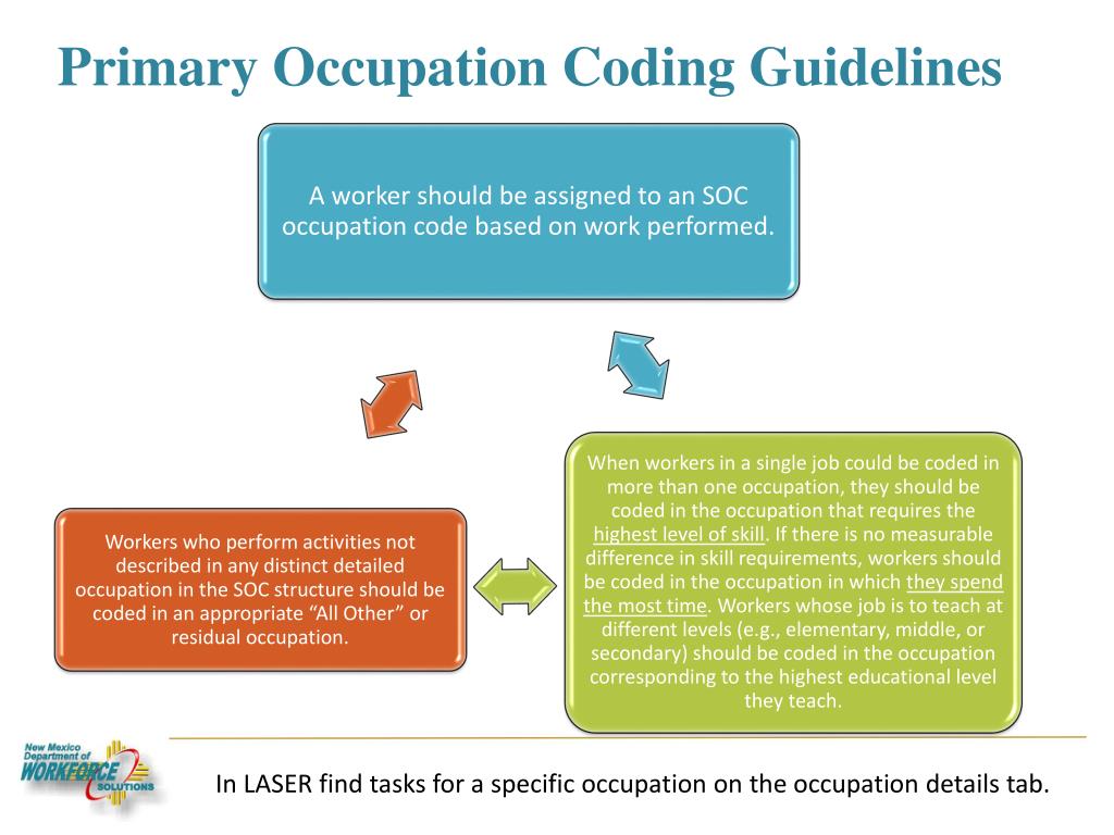 Primary Occupation Coding Guidelines In LASER find tasks for a specific occupation on the occupation details tab.