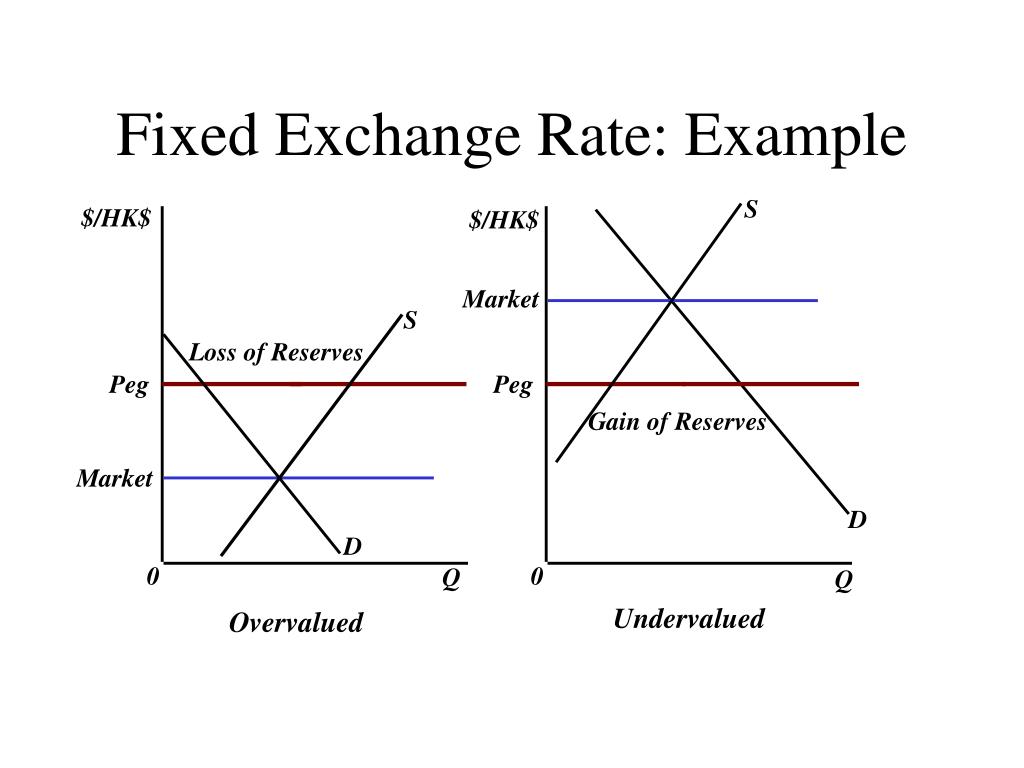 Fixed Exchange Rate: Example S $/HK$ $/HK$ Market S Loss of Reserves Peg Peg Gain of Reserves Market D D 0 0 Q Q Undervalued Overvalued