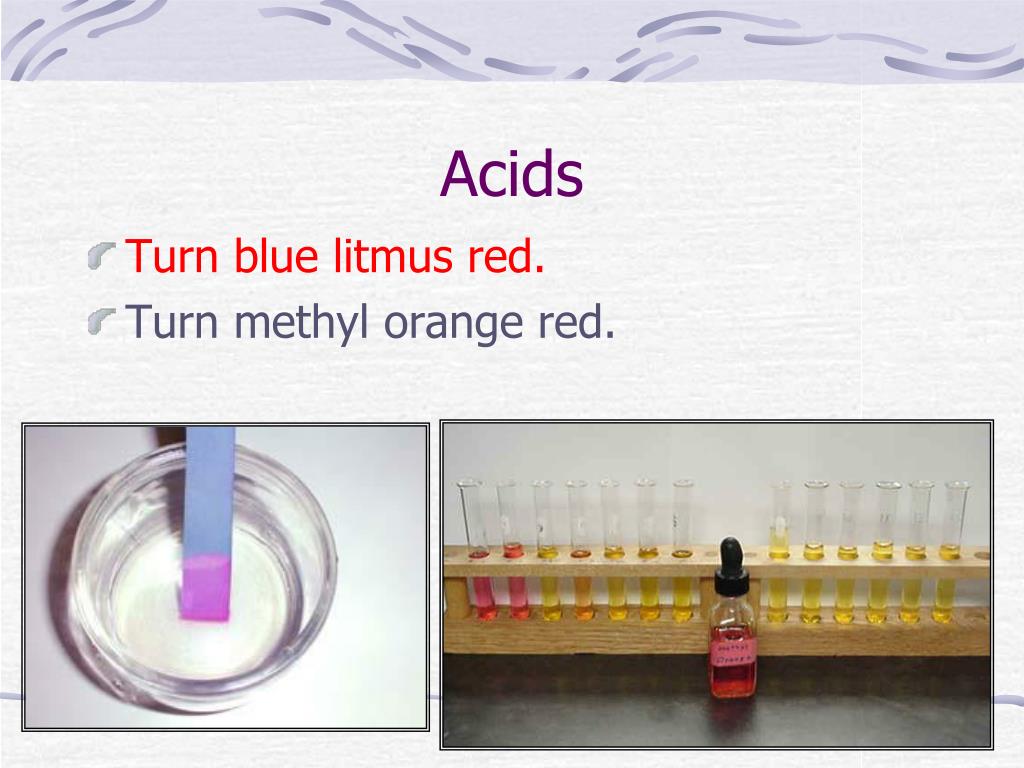Acids • Turn blue litmus red. • Turn methyl orange red.