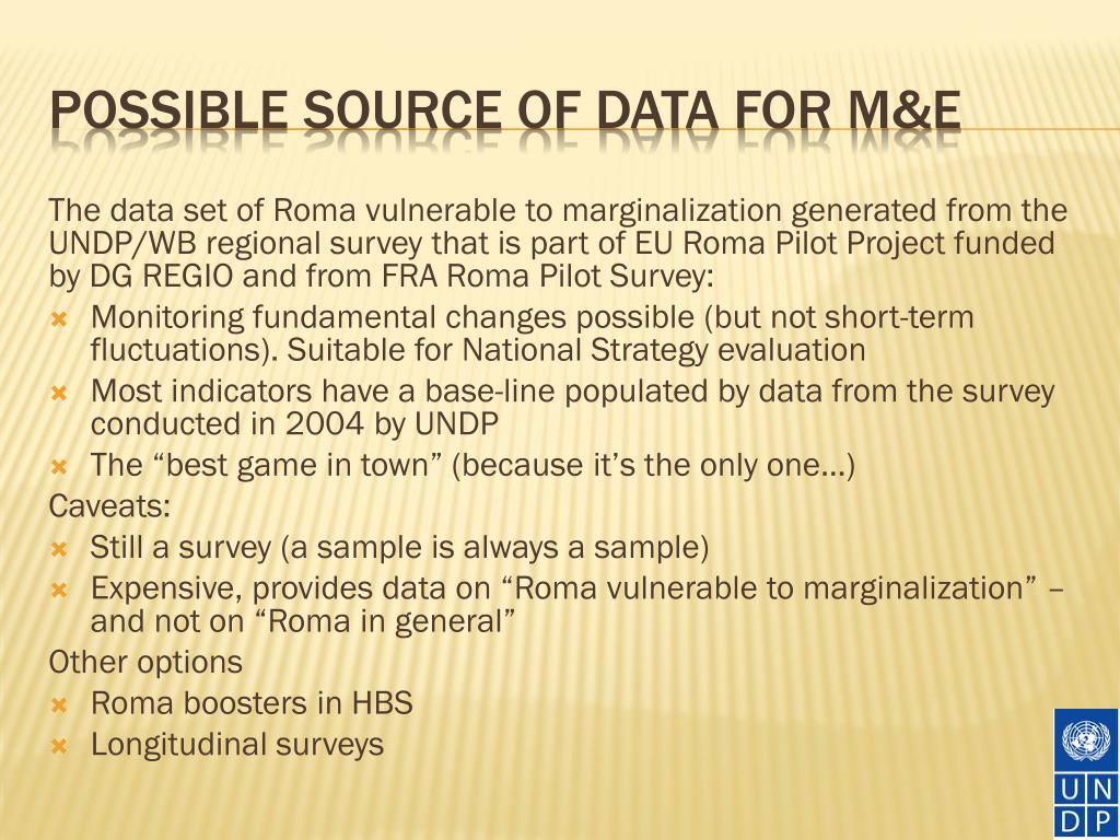 Possible source of data for M&E The data set of Roma vulnerable to marginalization generated from the UNDP/WB regional survey that is part of EU Roma Pilot Project funded by DG REGIO and from FRA Roma Pilot Survey: • Monitoring fundamental changes possible (but not short-term fluctuations). Suitable for National Strategy evaluation • Most indicators have a base-line populated by data from the survey conducted in 2004 by UNDP • The “best game in town” (because it’s the only one…) Caveats: • Still a survey (a sample is always a sample) • Expensive, provides data on “Roma vulnerable to marginalization” – and not on “Roma in general” Other options • Roma boosters in HBS • Longitudinal surveys