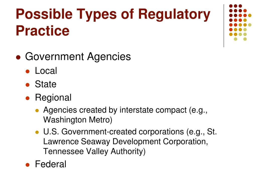 Possible Types of Regulatory Practice • Government Agencies • Local • State • Regional • Agencies created by interstate compact (e.g., Washington Metro) • U.S. Government-created corporations (e.g., St. Lawrence Seaway Development Corporation, Tennessee Valley Authority) • Federal