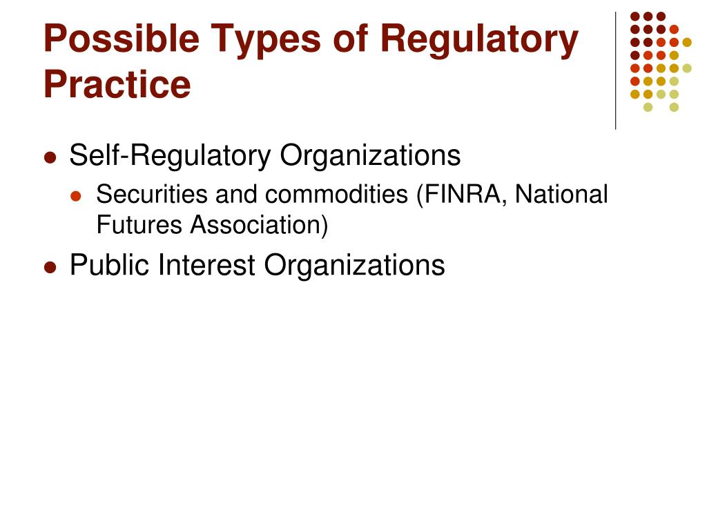 Possible Types of Regulatory Practice • Self-Regulatory Organizations • Securities and commodities (FINRA, National Futures Association) • Public Interest Organizations