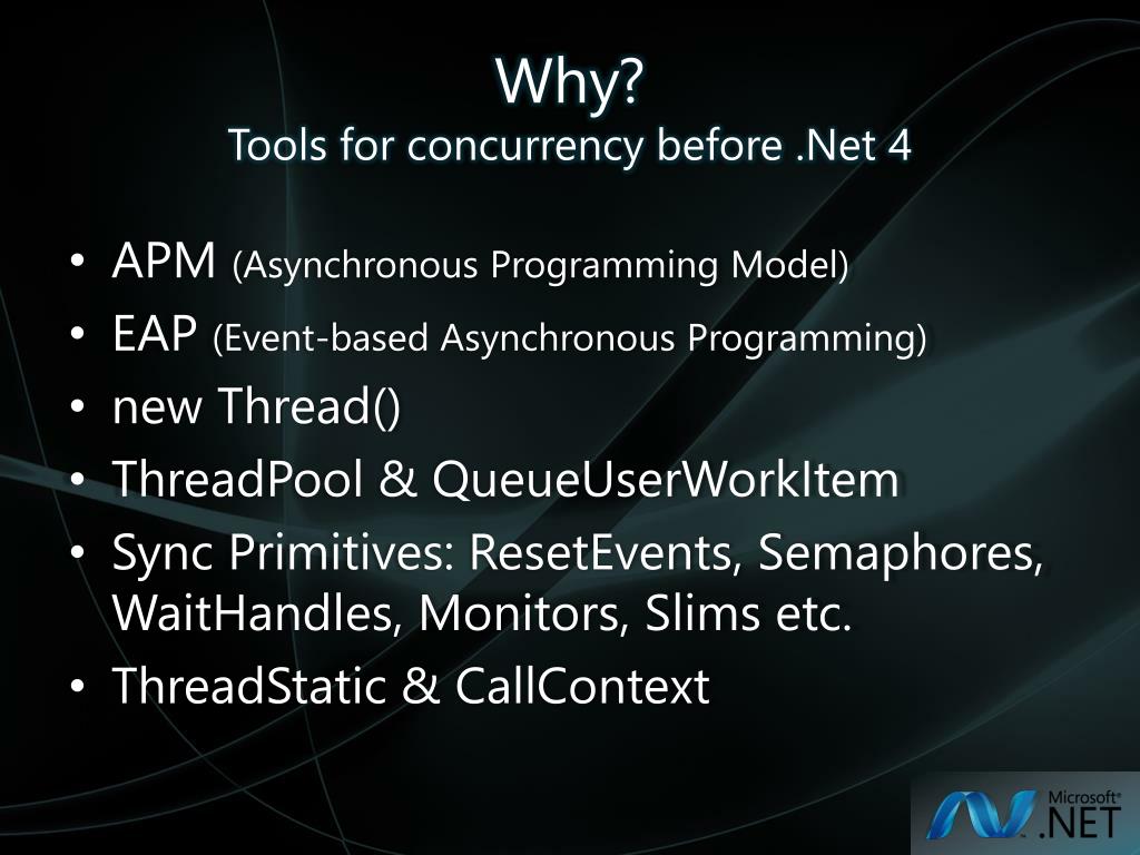 Why? Tools for concurrency before .Net 4 APM (Asynchronous Programming Model) EAP (Event-based Asynchronous Programming) new Thread() ThreadPool & QueueUserWorkItem Sync Primitives: ResetEvents, Semaphores, WaitHandles, Monitors, Slims etc. ThreadStatic & CallContext