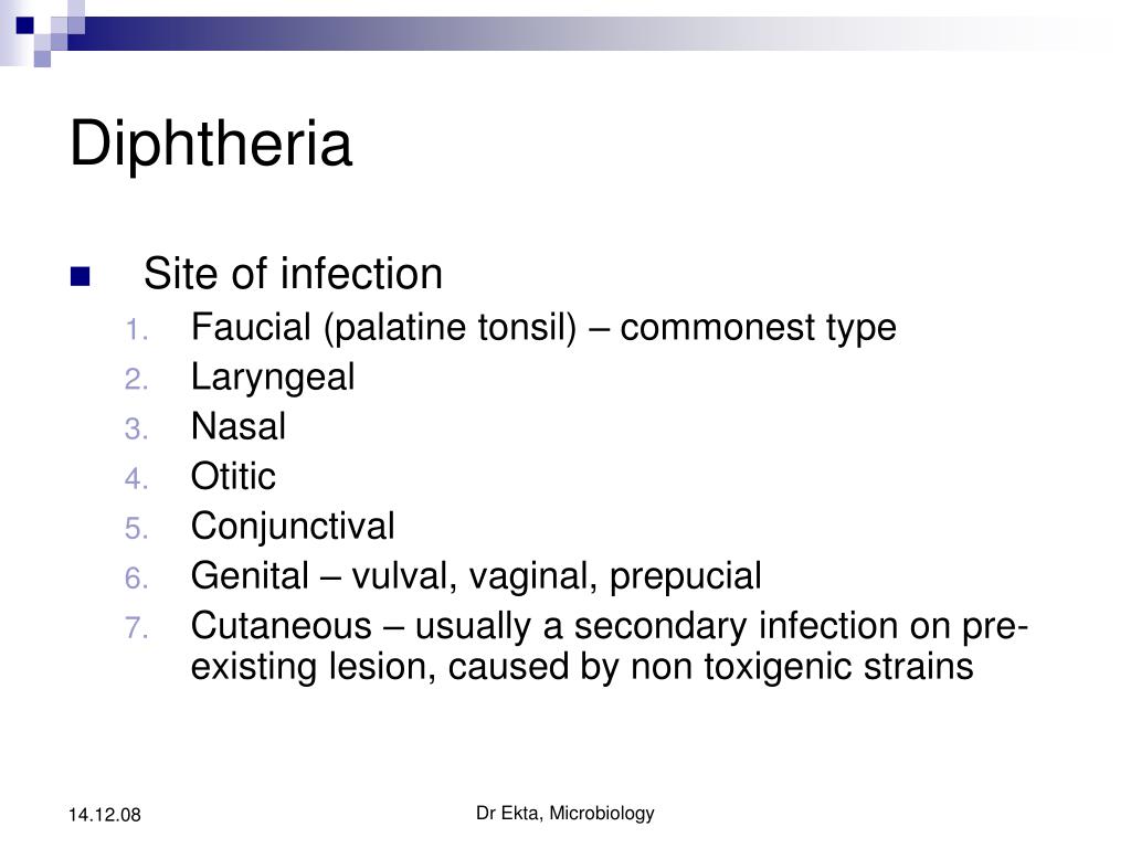 Diphtheria • Site of infection • Faucial (palatine tonsil) – commonest type • Laryngeal • Nasal • Otitic • Conjunctival • Genital – vulval, vaginal, prepucial • Cutaneous – usually a secondary infection on pre-existing lesion, caused by non toxigenic strains Dr Ekta, Microbiology