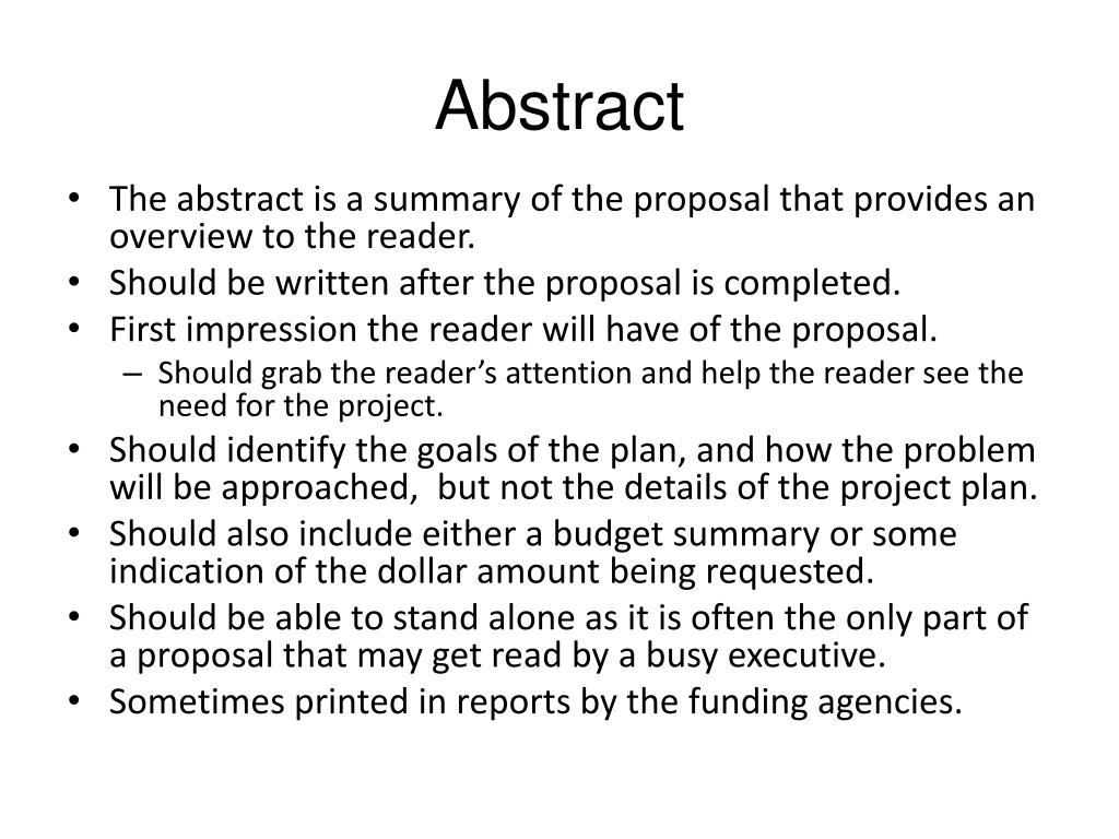 Abstract • The abstract is a summary of the proposal that provides an overview to the reader. • Should be written after the proposal is completed. • First impression the reader will have of the proposal. • Should grab the reader’s attention and help the reader see the need for the project. • Should identify the goals of the plan, and how the problem will be approached, but not the details of the project plan. • Should also include either a budget summary or some indication of the dollar amount being requested. • Should be able to stand alone as it is often the only part of a proposal that may get read by a busy executive. • Sometimes printed in reports by the funding agencies.