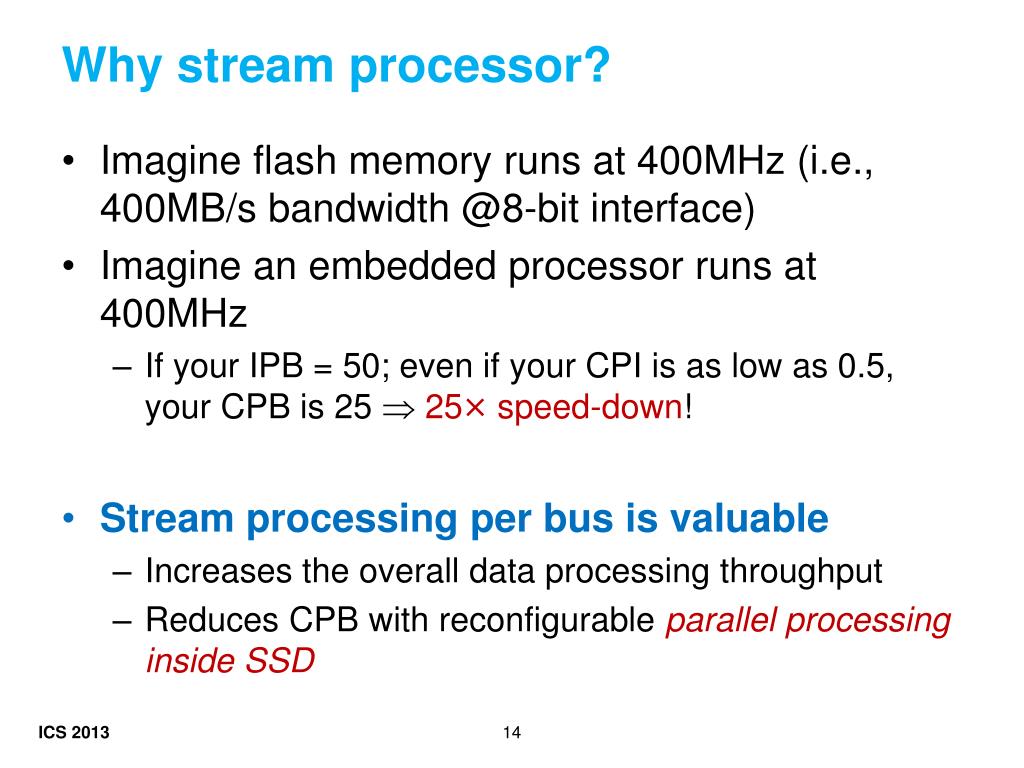 Why stream processor? • Imagine flash memory runs at 400MHz (i.e., 400MB/s bandwidth @8-bit interface) • Imagine an embedded processor runs at 400MHz • If your IPB = 50; even if your CPI is as low as 0.5, your CPB is 25 25× speed-down! • Stream processing per bus is valuable • Increases the overall data processing throughput • Reduces CPB with reconfigurable parallel processing inside SSD