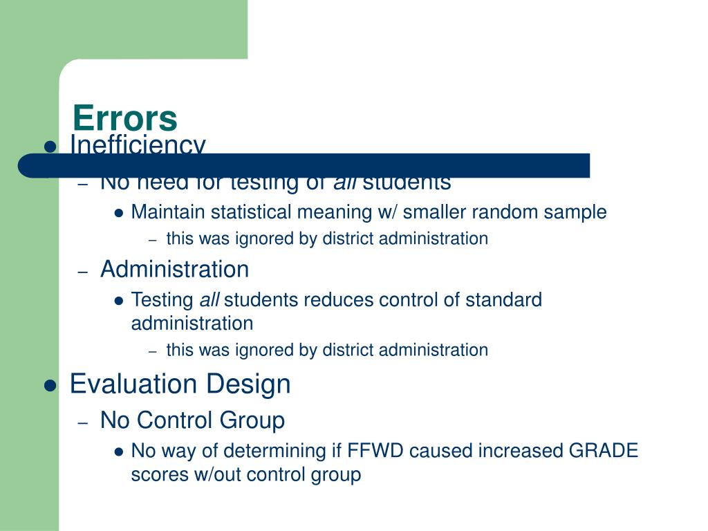 Errors • Inefficiency • No need for testing of all students • Maintain statistical meaning w/ smaller random sample • this was ignored by district administration • Administration • Testing all students reduces control of standard administration • this was ignored by district administration • Evaluation Design • No Control Group • No way of determining if FFWD caused increased GRADE scores w/out control group