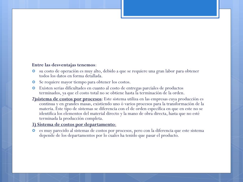 Entre las desventajas tenemos: • su costo de operación es muy alto, debido a que se requiere una gran labor para obtener todos los datos en forma detallada. • Se requiere mayor tiempo para obtener los costos. • Existen serias dificultades en cuanto al costo de entregas parciales de productos terminados, ya que el costo total no se obtiene hasta la terminación de la orden. 2)sistema de costos por procesos: Este sistema utiliza en las empresas cuya producción es continua y en grandes masas, existiendo uno ó varios procesos para la transformación de la materia. Este tipo de sistemas se diferencia con el de orden específica en que en este no se identifica los elementos del material directo y la mano de obra directa, hasta que no esté terminada la producción completa. 3) Sistema de costos por departamento: • es muy parecido al sistemas de costos por procesos, pero con la diferencia que este sistema depende de los departamentos por lo cuales ha tenido que pasar el producto.