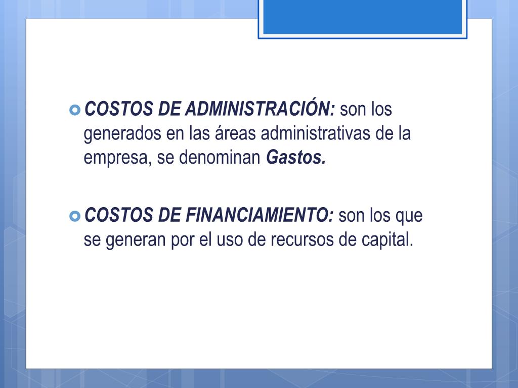 COSTOS DE ADMINISTRACIÓN: son los generados en las áreas administrativas de la empresa, se denominan Gastos. • COSTOS DE FINANCIAMIENTO: son los que se generan por el uso de recursos de capital.