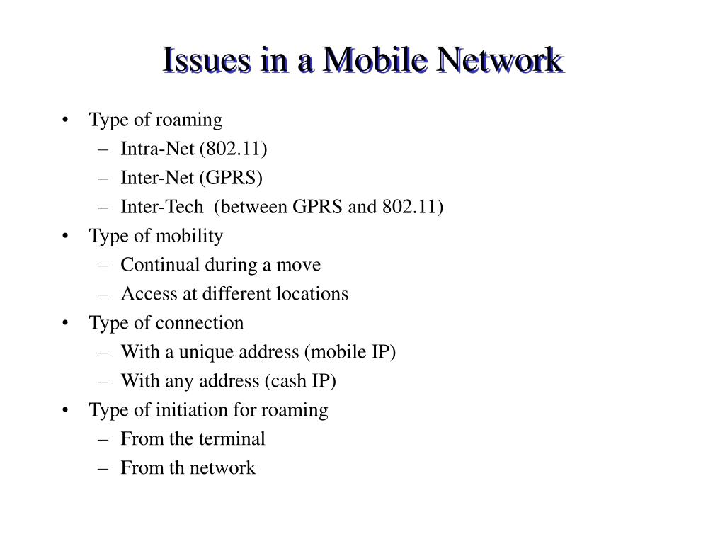 Issues in a Mobile Network • Type of roaming • Intra-Net (802.11) • Inter-Net (GPRS) • Inter-Tech (between GPRS and 802.11) • Type of mobility • Continual during a move • Access at different locations • Type of connection • With a unique address (mobile IP) • With any address (cash IP) • Type of initiation for roaming • From the terminal • From th network