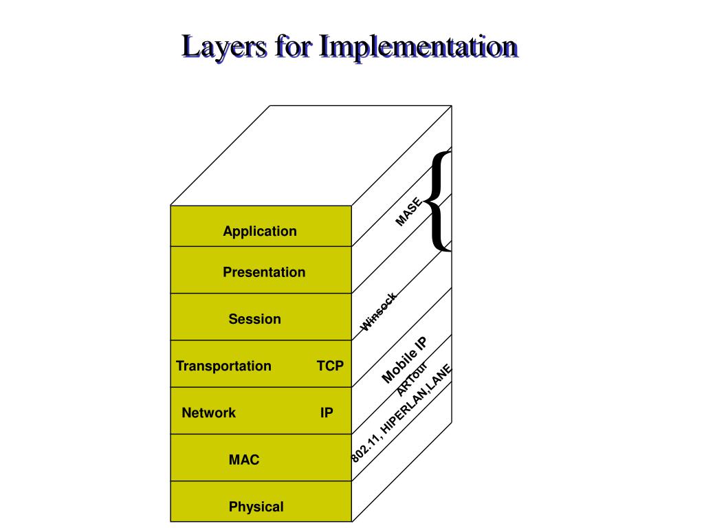 Layers for Implementation { MASE Application Presentation Winsock Session Mobile IP Transportation TCP ARTour Network IP 802.11, HIPERLAN,LANE MAC Physical