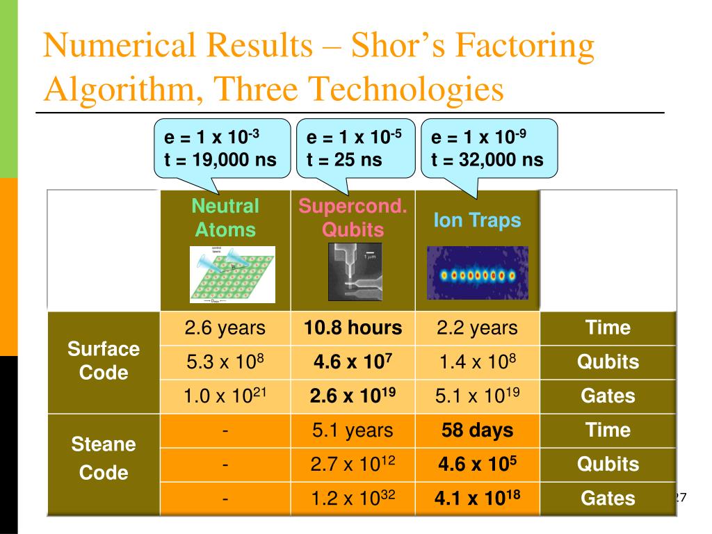 Numerical Results – Shor’s Factoring Algorithm, Three Technologies e = 1 x 10-3 t = 19,000 ns e = 1 x 10-5 t = 25 ns e = 1 x 10-9 t = 32,000 ns