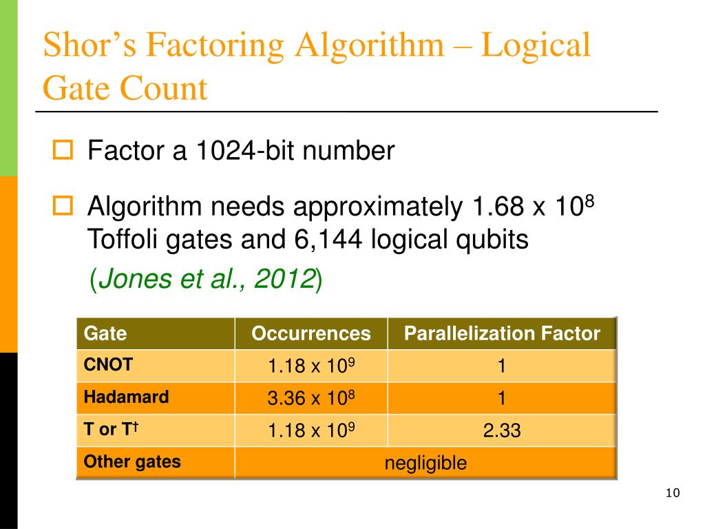Shor’s Factoring Algorithm – Logical Gate Count • Factor a 1024-bit number • Algorithm needs approximately 1.68 x 108Toffoli gates and 6,144 logical qubits • (Jones et al., 2012)