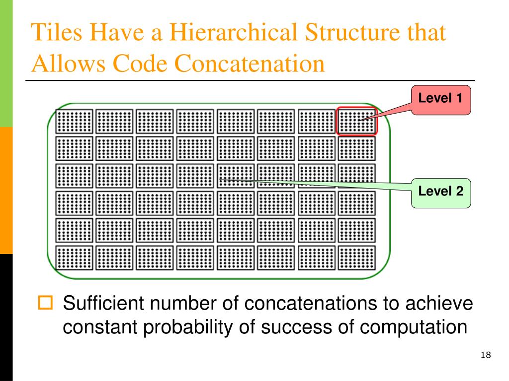 Tiles Have a Hierarchical Structure that Allows Code Concatenation Level 1 Level 2 • Sufficient number of concatenations to achieve constant probability of success of computation