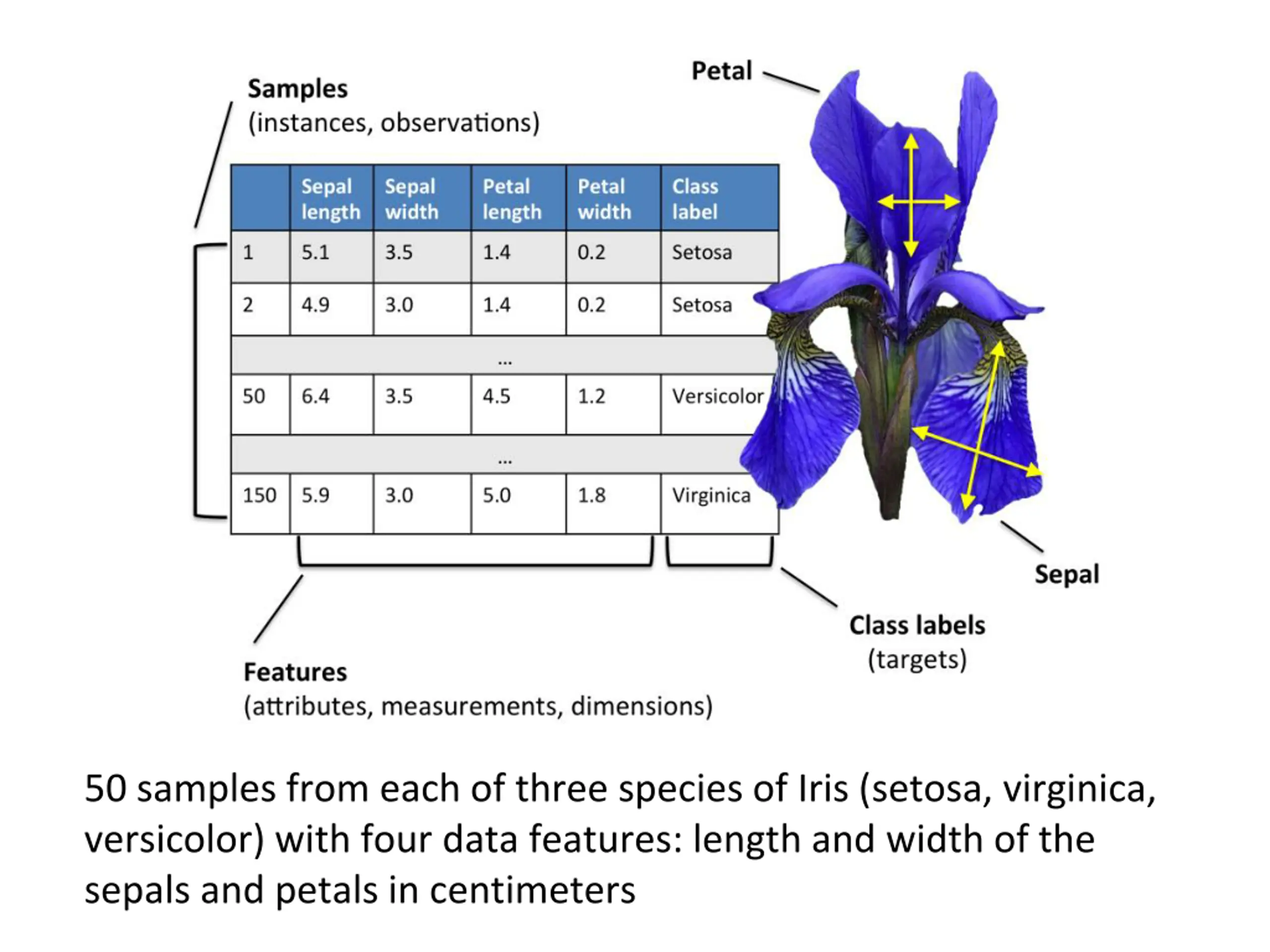 50 samples from each of three species of Iris (setosa, virginica, versicolor) with four data features: length and width of the sepals and petals in centimeters