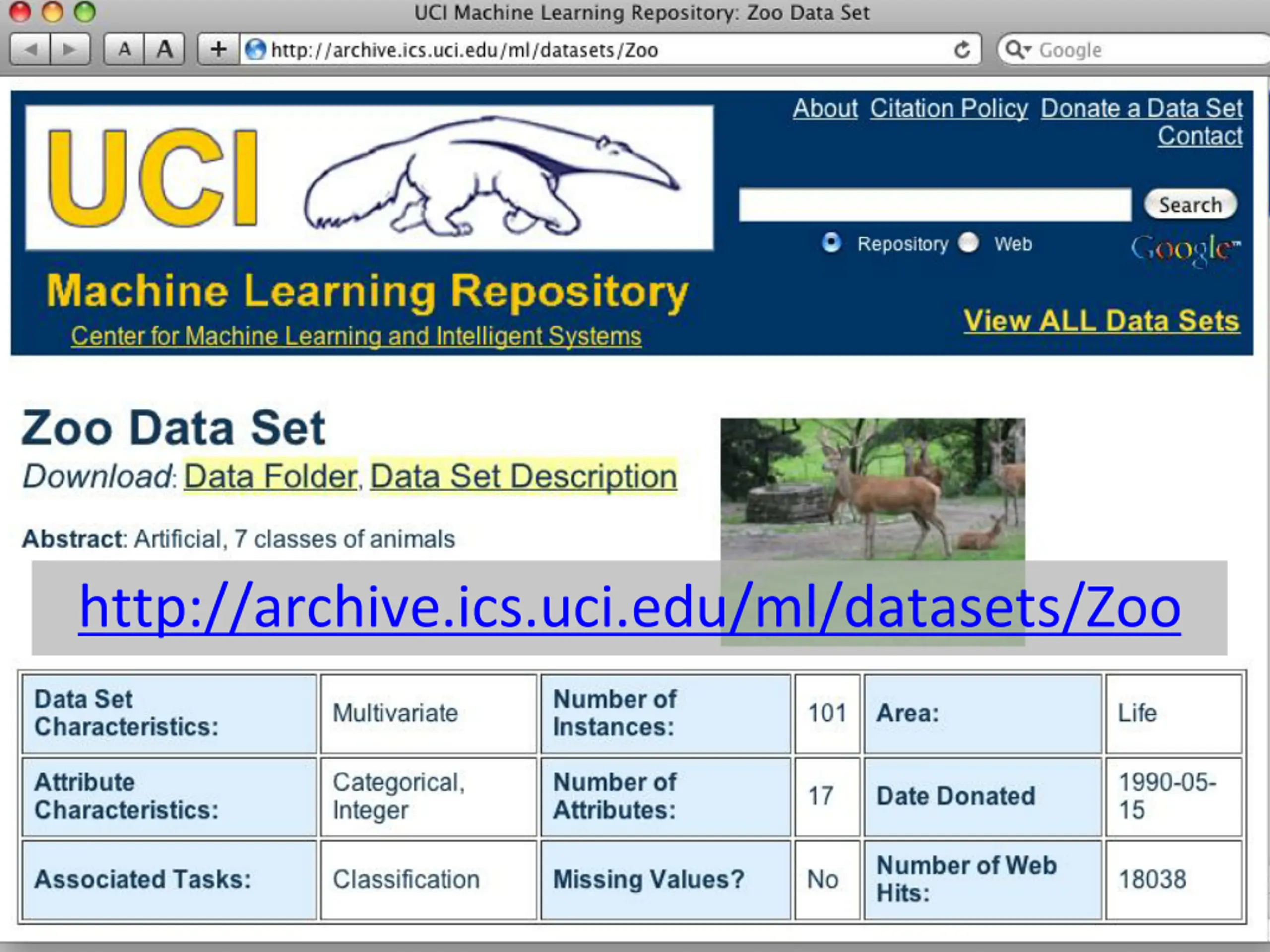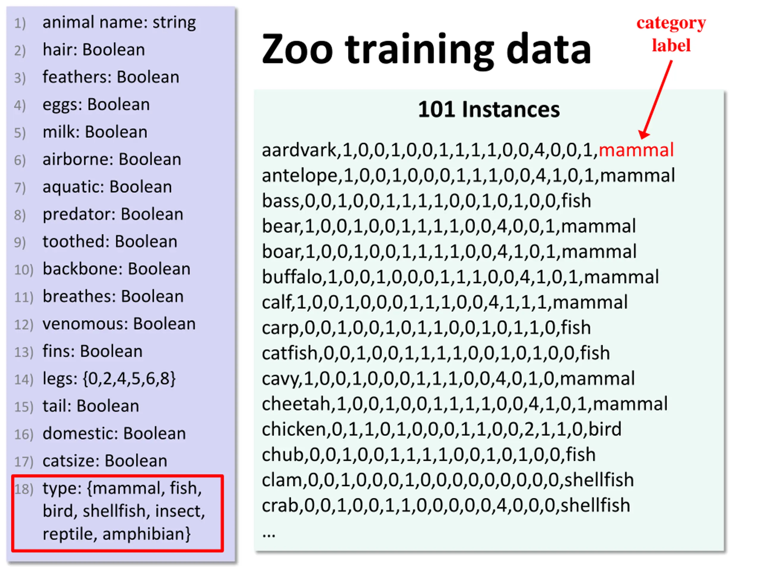 category label 1) animal name: string Zoo training data 2) hair: Boolean 3) feathers: Boolean 4) eggs: Boolean 101 Instances 5) milk: Boolean aardvark,1,0,0,1,0,0,1,1,1,1,0,0,4,0,0,1,mammal antelope,1,0,0,1,0,0,0,1,1,1,0,0,4,1,0,1,mammal bass,0,0,1,0,0,1,1,1,1,0,0,1,0,1,0,0,fish bear,1,0,0,1,0,0,1,1,1,1,0,0,4,0,0,1,mammal boar,1,0,0,1,0,0,1,1,1,1,0,0,4,1,0,1,mammal buffalo,1,0,0,1,0,0,0,1,1,1,0,0,4,1,0,1,mammal calf,1,0,0,1,0,0,0,1,1,1,0,0,4,1,1,1,mammal carp,0,0,1,0,0,1,0,1,1,0,0,1,0,1,1,0,fish catfish,0,0,1,0,0,1,1,1,1,0,0,1,0,1,0,0,fish cavy,1,0,0,1,0,0,0,1,1,1,0,0,4,0,1,0,mammal cheetah,1,0,0,1,0,0,1,1,1,1,0,0,4,1,0,1,mammal chicken,0,1,1,0,1,0,0,0,1,1,0,0,2,1,1,0,bird chub,0,0,1,0,0,1,1,1,1,0,0,1,0,1,0,0,fish clam,0,0,1,0,0,0,1,0,0,0,0,0,0,0,0,0,shellfish crab,0,0,1,0,0,1,1,0,0,0,0,0,4,0,0,0,shellfish … 6) airborne: Boolean 7) aquatic: Boolean 8) predator: Boolean 9) toothed: Boolean 10) backbone: Boolean 11) breathes: Boolean 12) venomous: Boolean 13) fins: Boolean 14) legs: {0,2,4,5,6,8} 15) tail: Boolean 16) domestic: Boolean 17) catsize: Boolean 18) type: {mammal, fish, bird, shellfish, insect, reptile, amphibian}