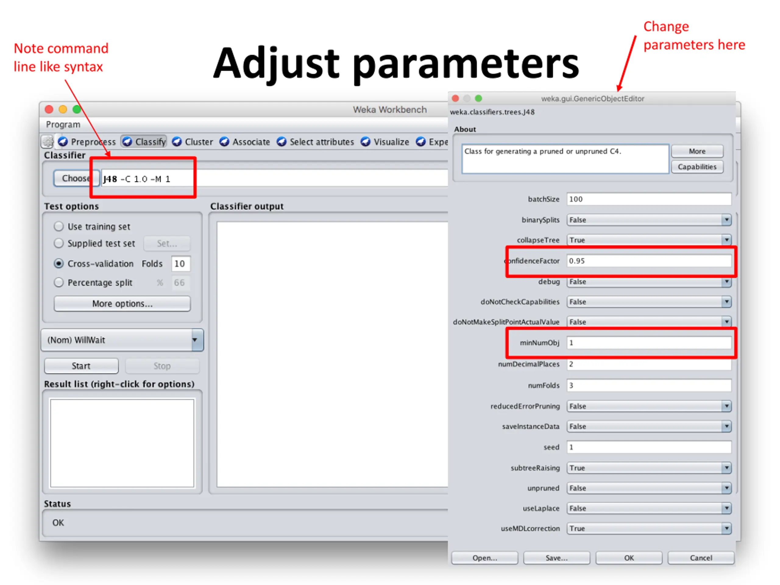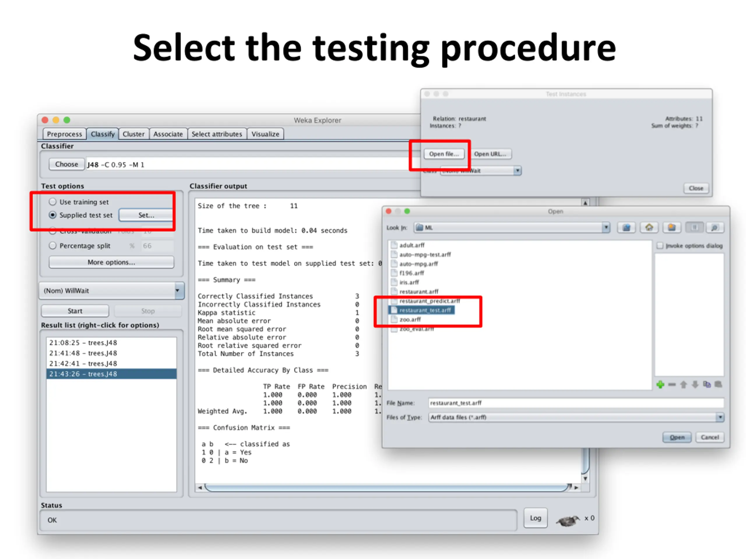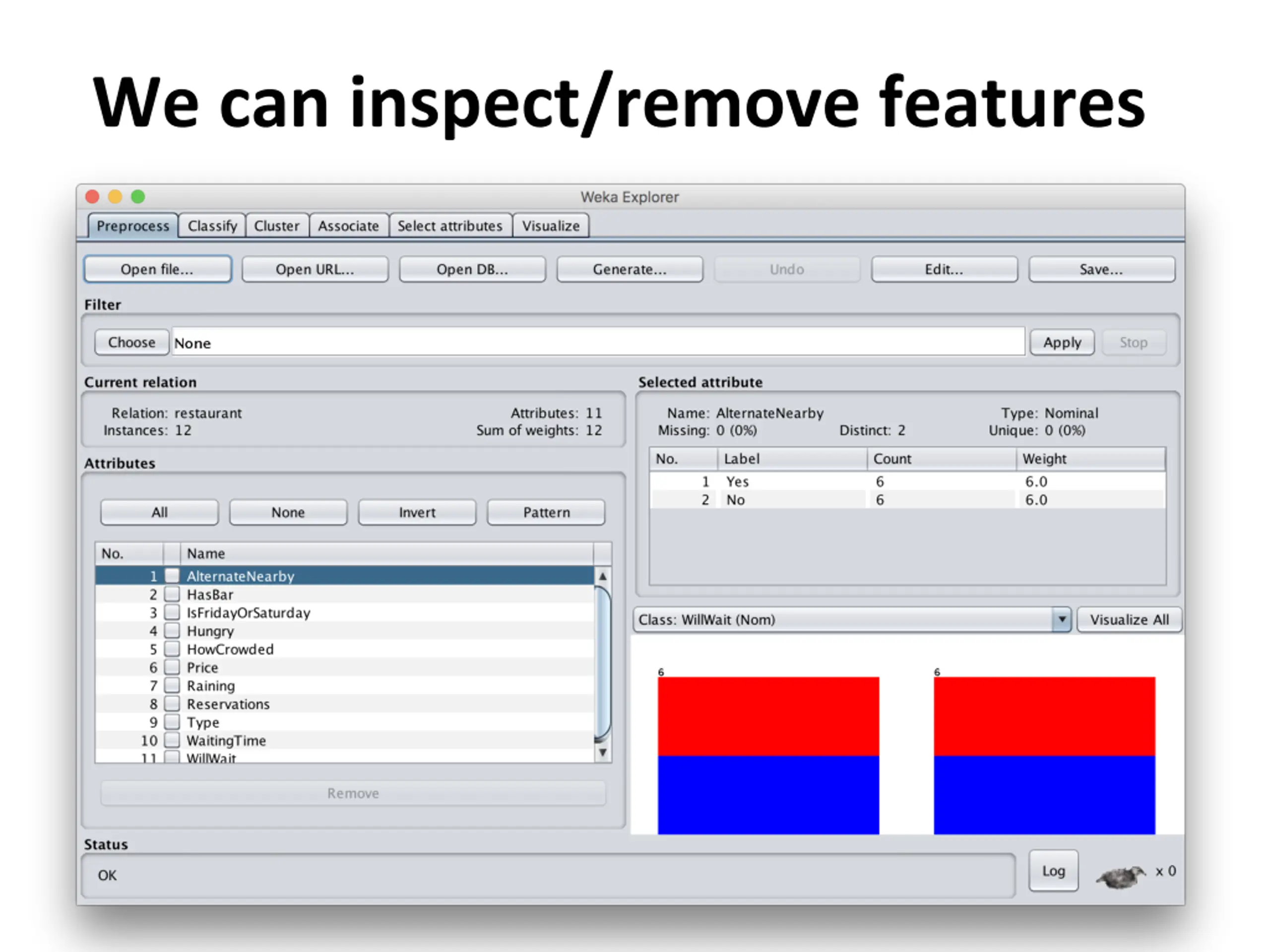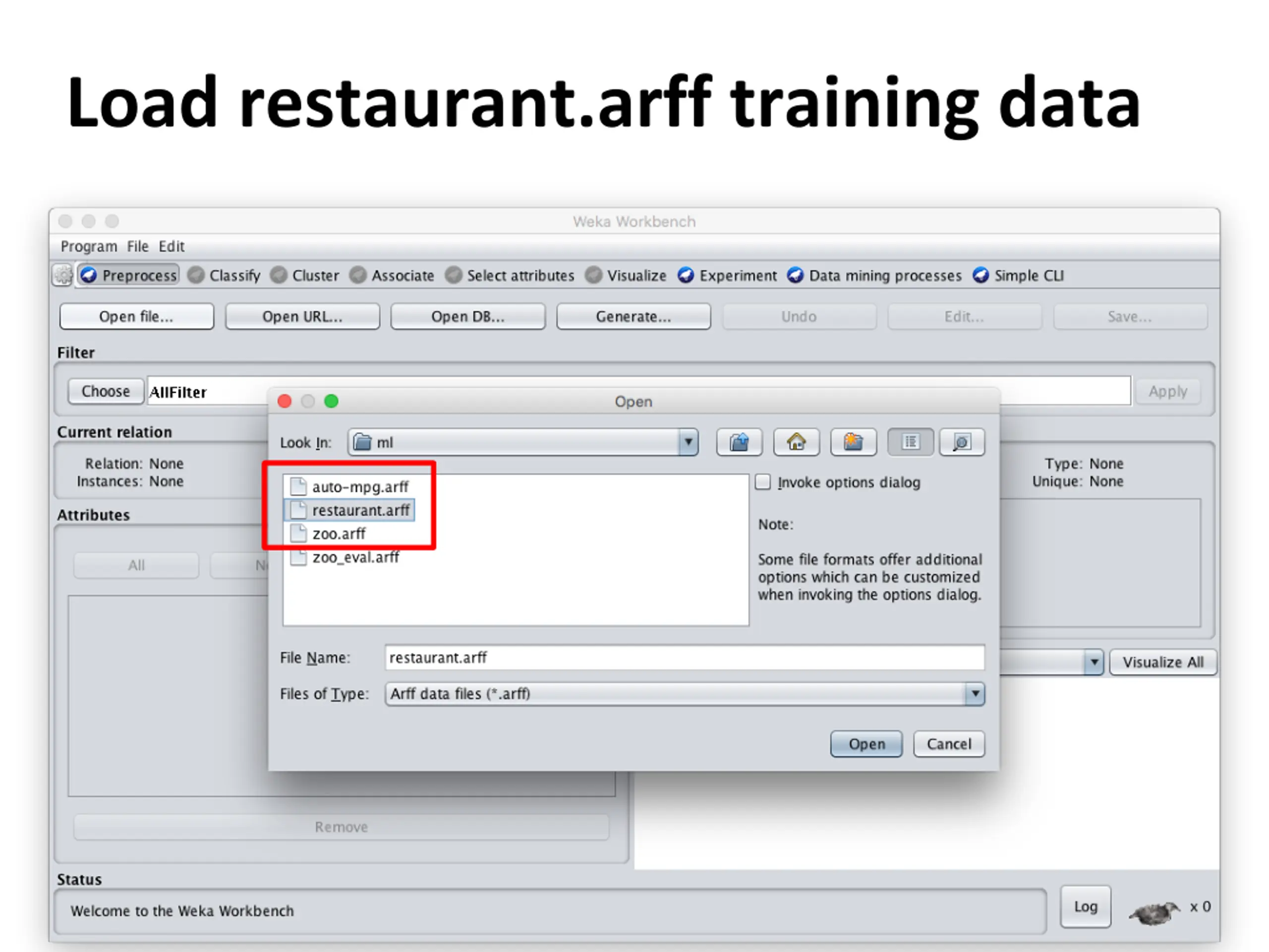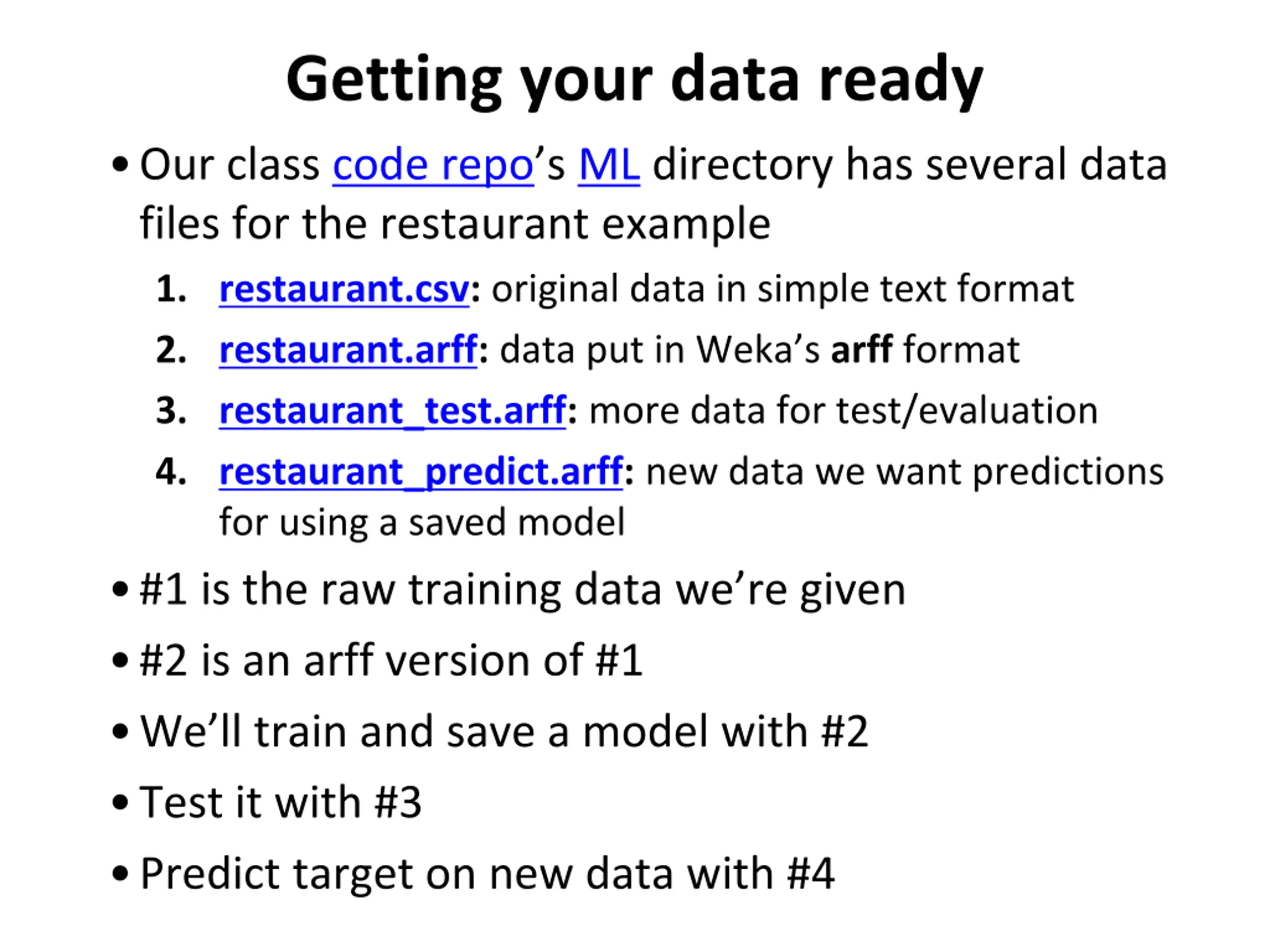 Getting your data ready •Our class code repo’s ML directory has several data files for the restaurant example 1. restaurant.csv: original data in simple text format 2. restaurant.arff: data put in Weka’s arff format 3. restaurant_test.arff: more data for test/evaluation 4. restaurant_predict.arff: new data we want predictions for using a saved model •#1 is the raw training data we’re given •#2 is an arff version of #1 •We’ll train and save a model with #2 •Test it with #3 •Predict target on new data with #4